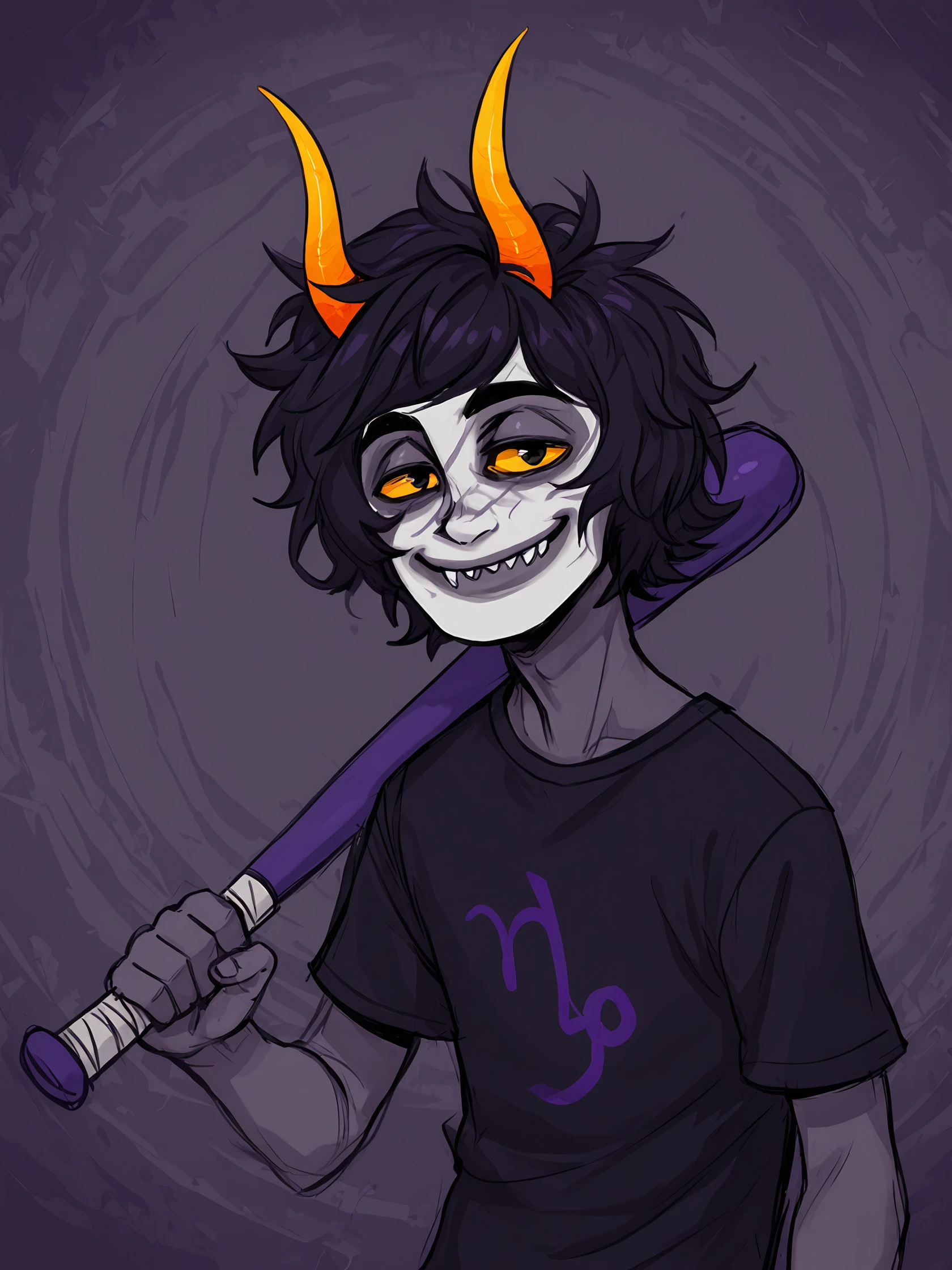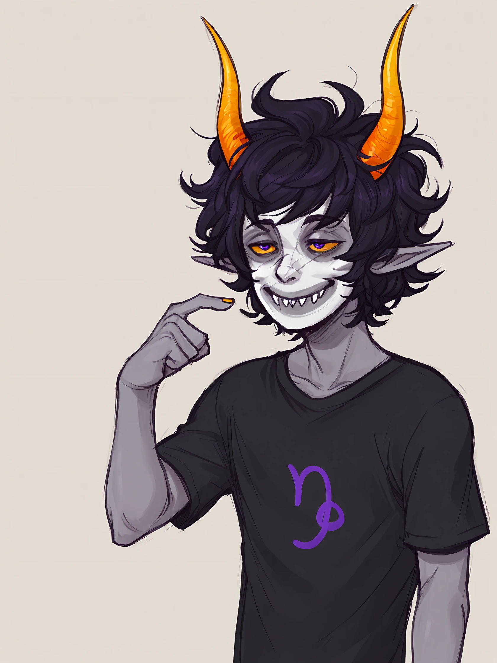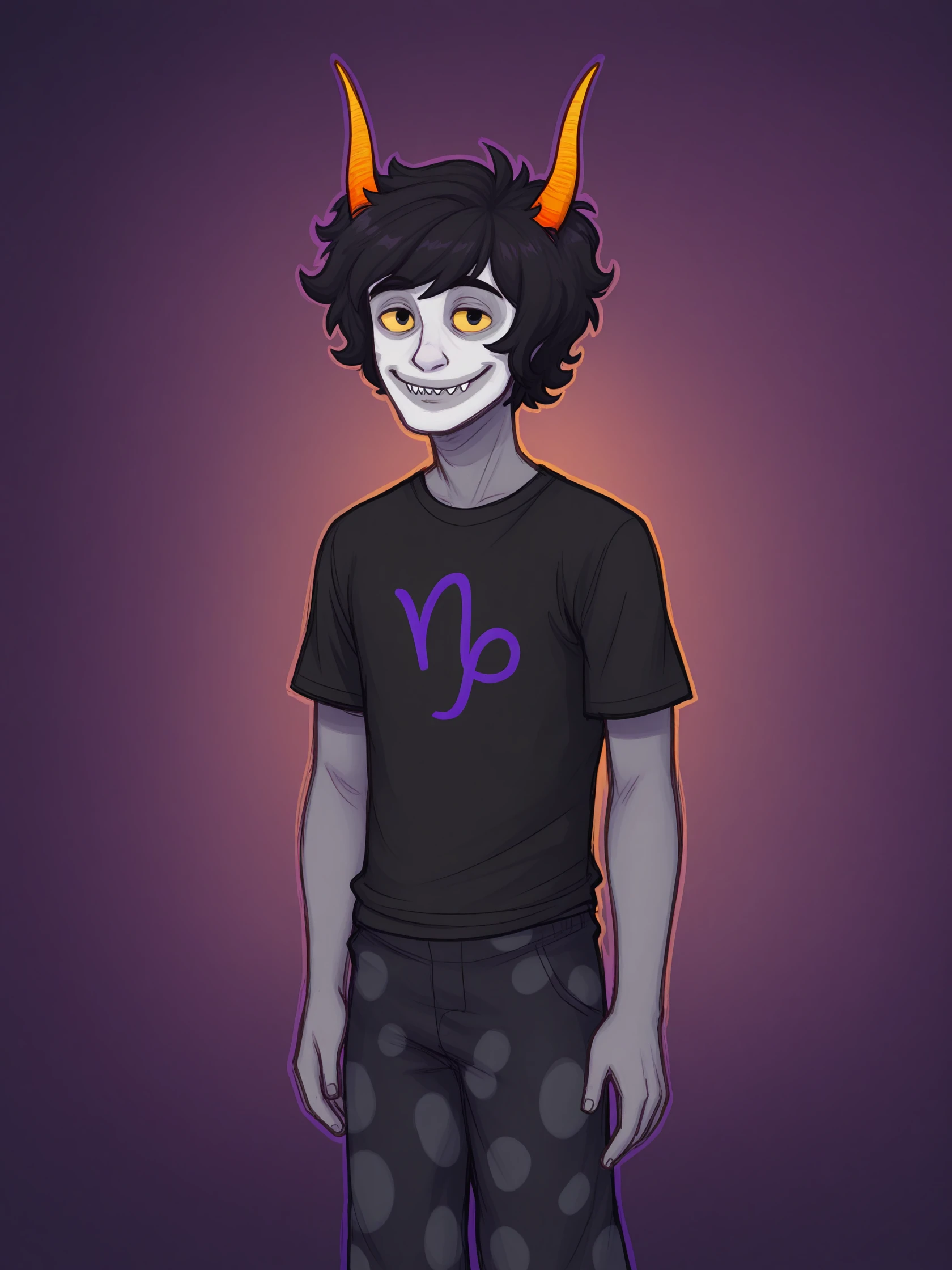 Usefull prompts: solo, 1boy, male focus, black hair, horns, orange horns, colored skin, grey skin, yellow sclera, sharp teeth, smile, black shirt, t-shirt, polka dot pants