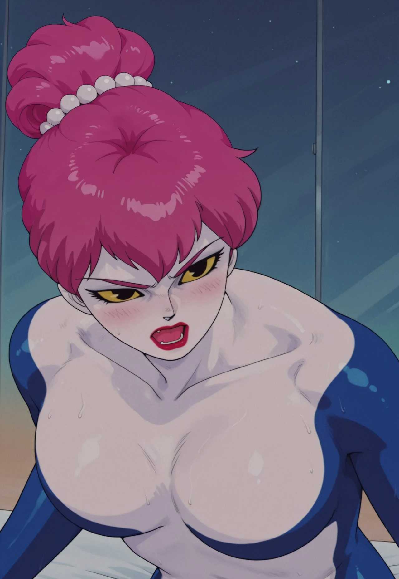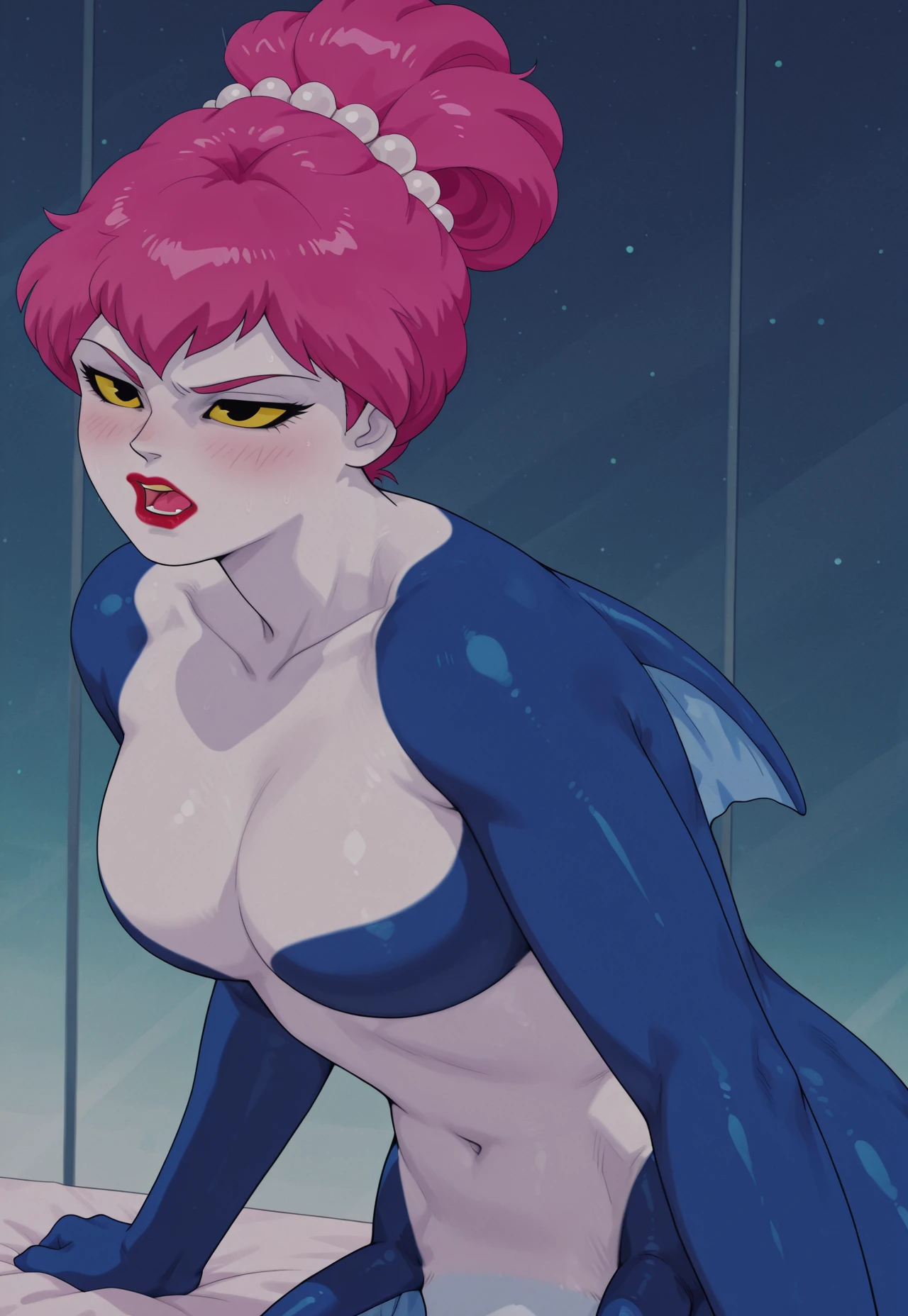 Kiss, blush, on a bed, , with a man, anime retro 90 style, blue skin mermaid tail, Blue skin ass, straight pink bun hair, , navel, pale white skin, thick long black eyelashes makeup, black eyes, white skin, blue skin arms, blue skin breasts, yellow sclera, mermaid, hair pearl accessories,