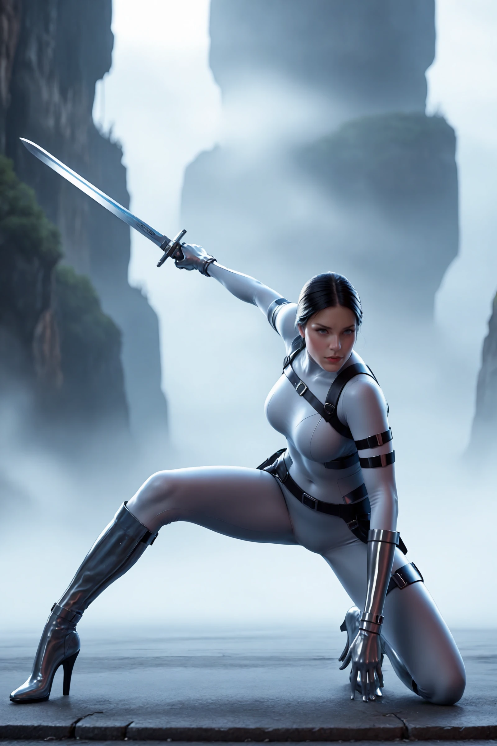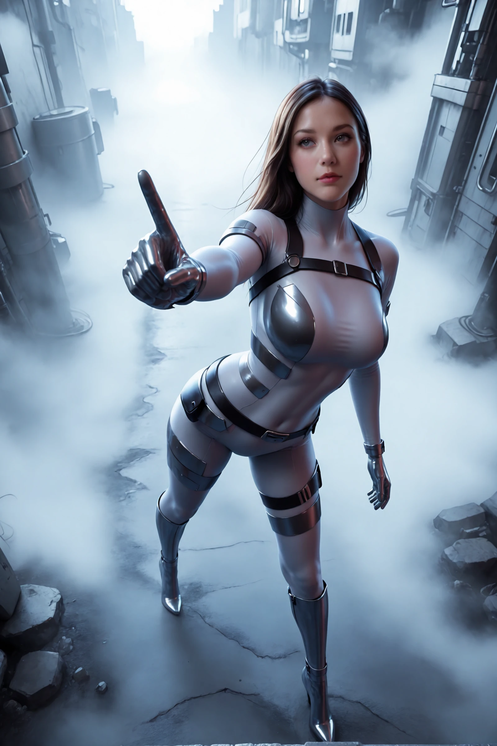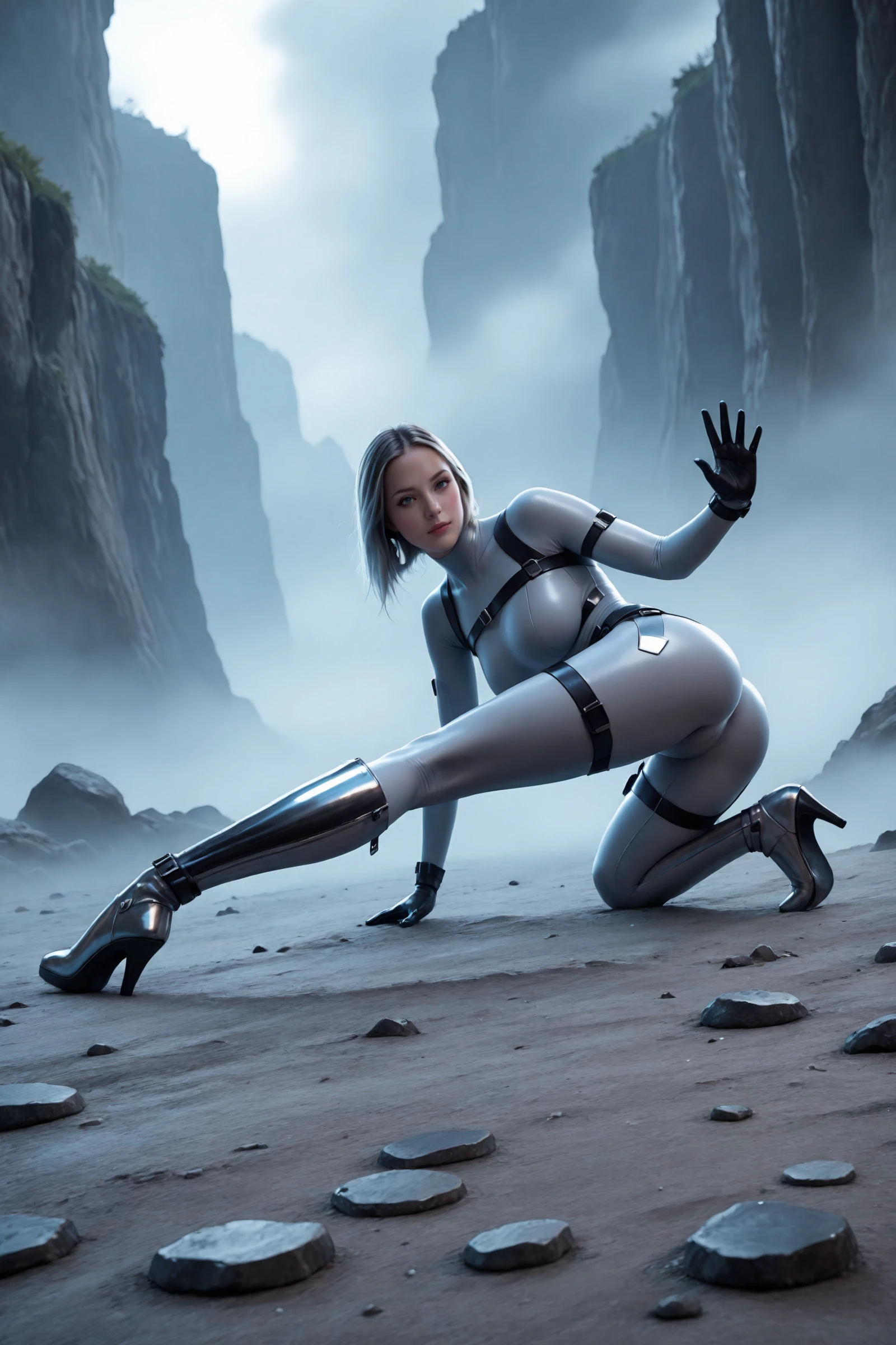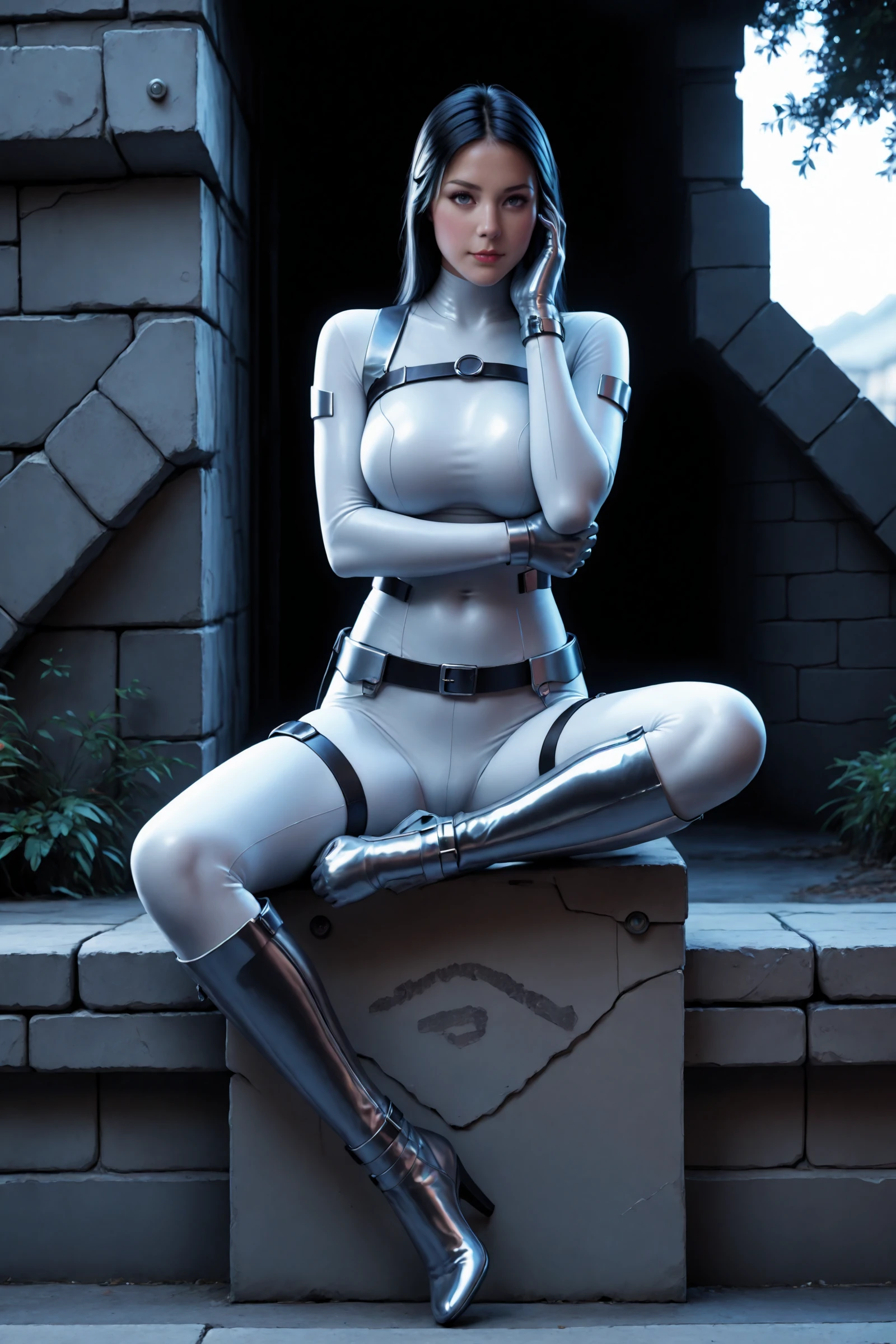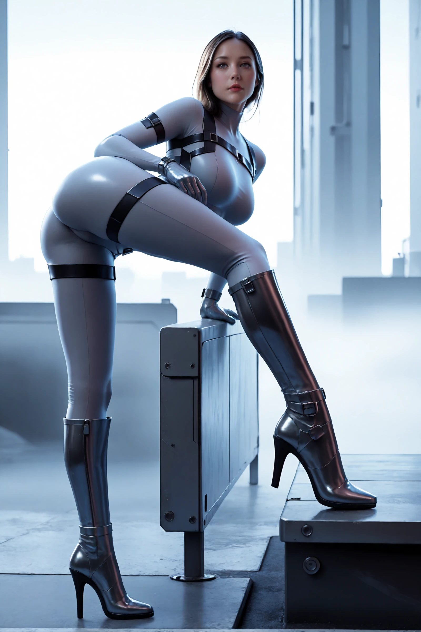 large_breasts,skin_tight,covered_navel, ,arm_belt,gloves,belt_buckle,garter_belt,belts, knee_boots,high_heels,