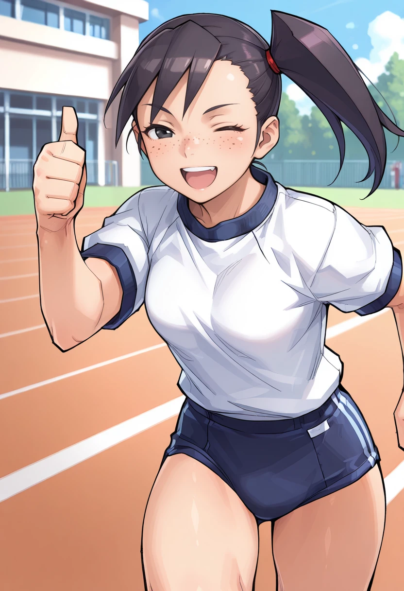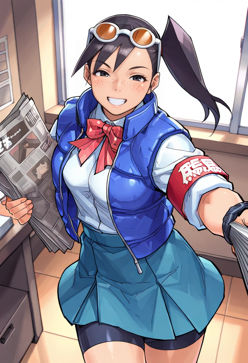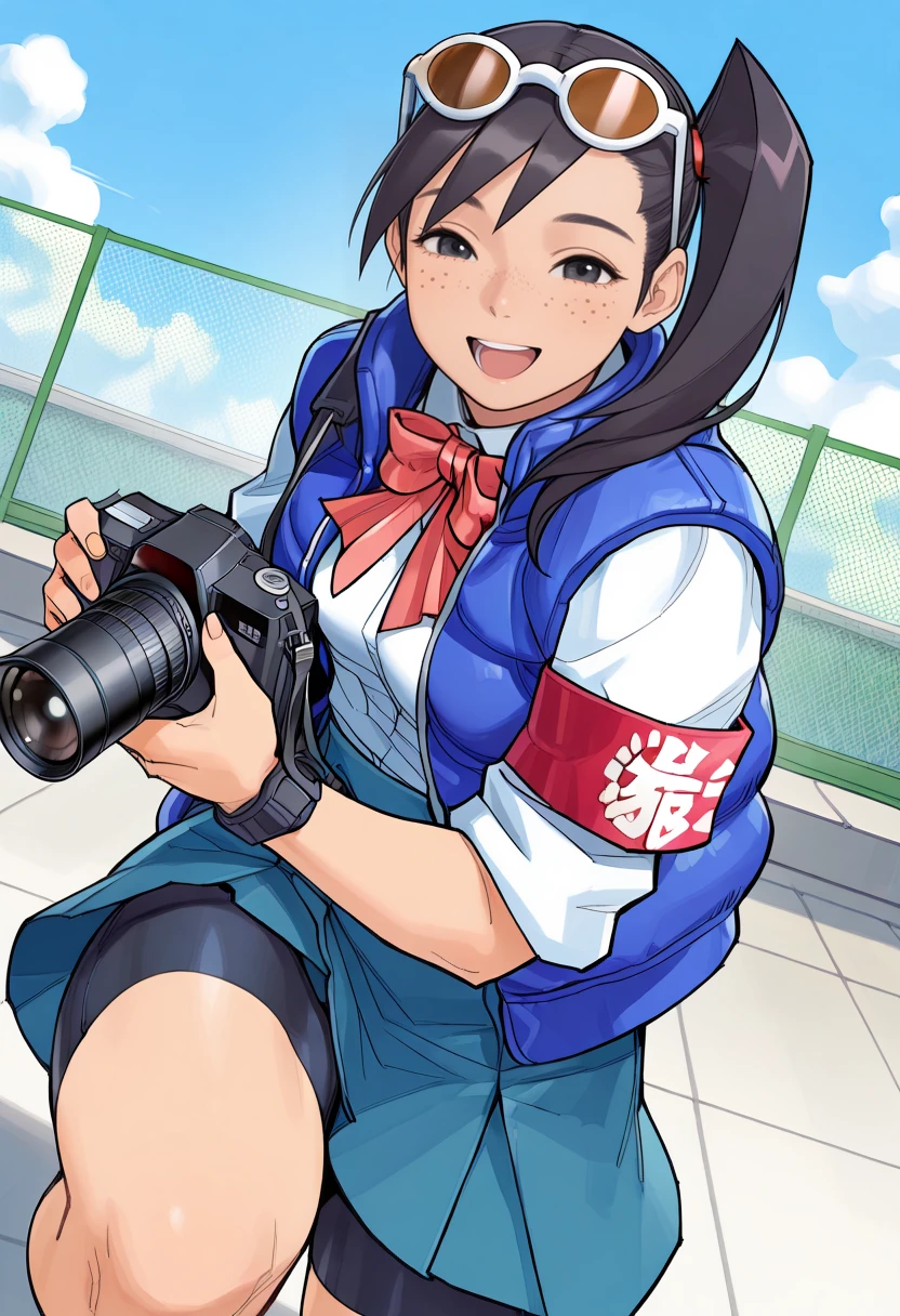 blue jacket, school uniform, bowtie, blue skirt, bike shorts, armband, eyewear on head, breasts, black hair, bangs, side ponytail, freckles, black eyes