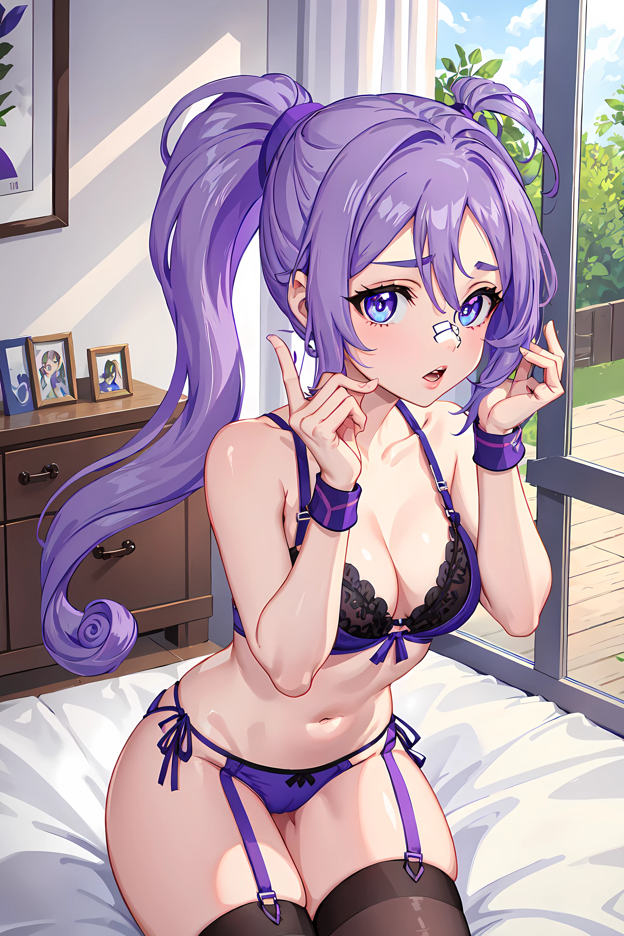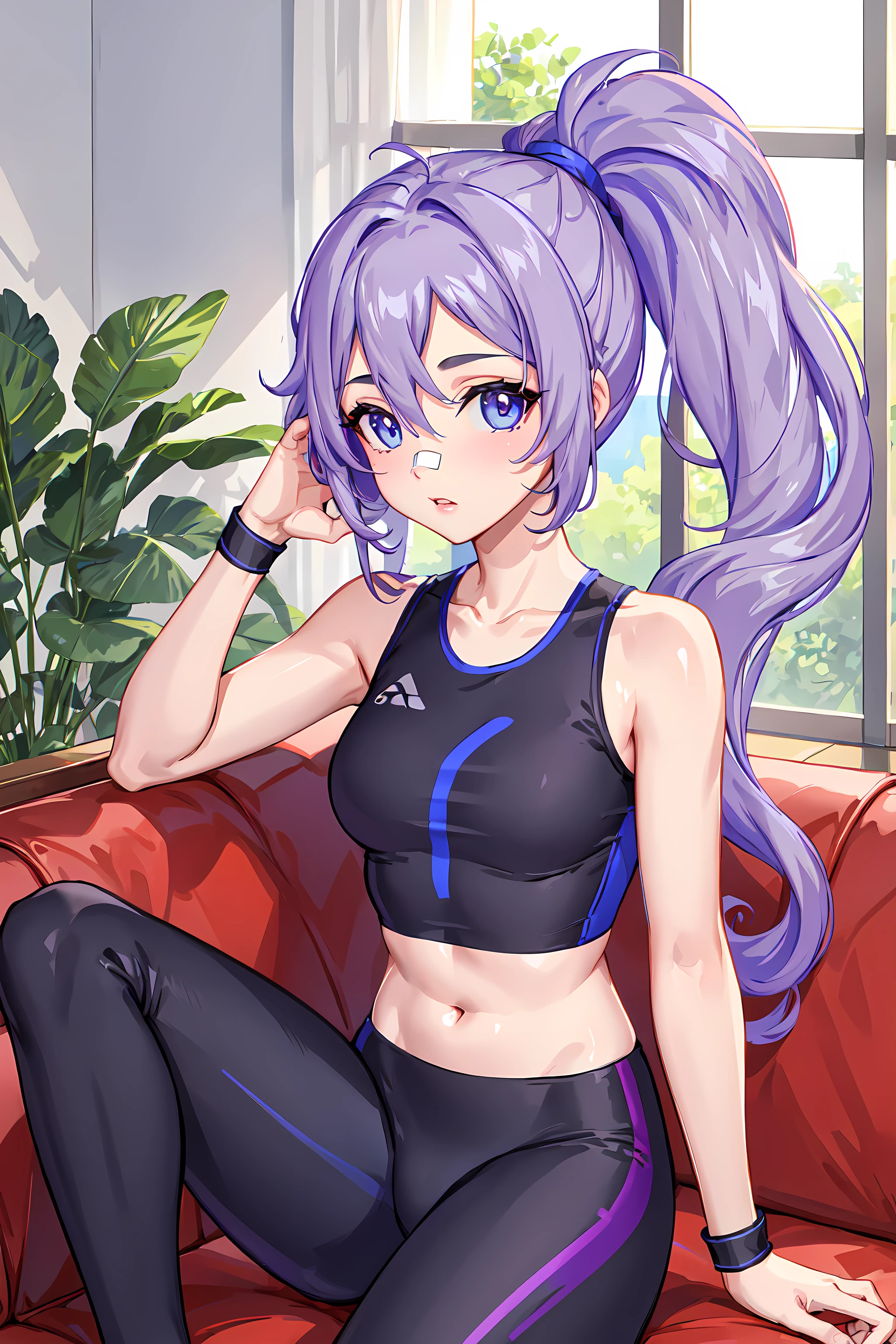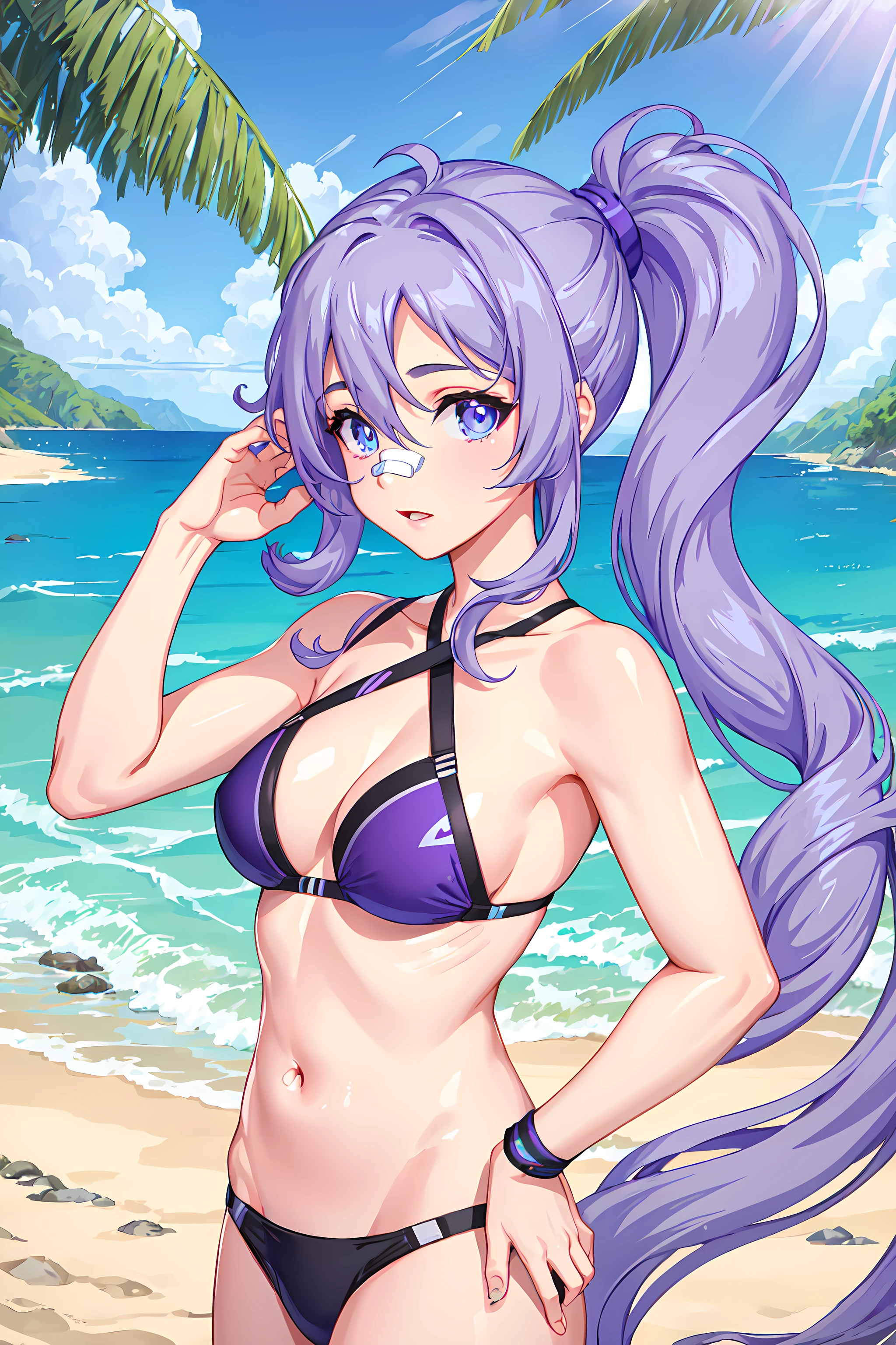 sawyer, 1girl, solo, blue eyes, purple hair, ponytail