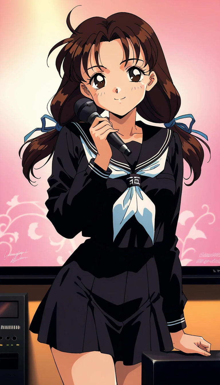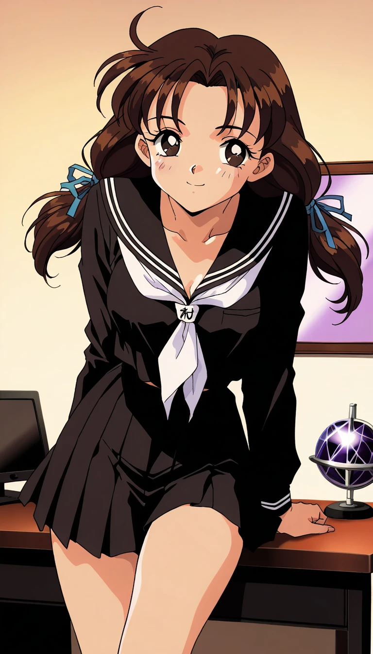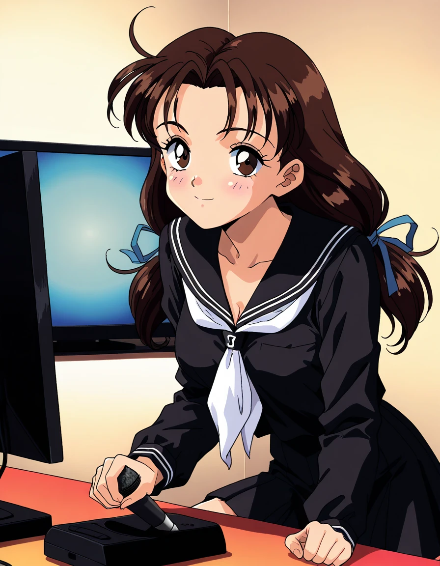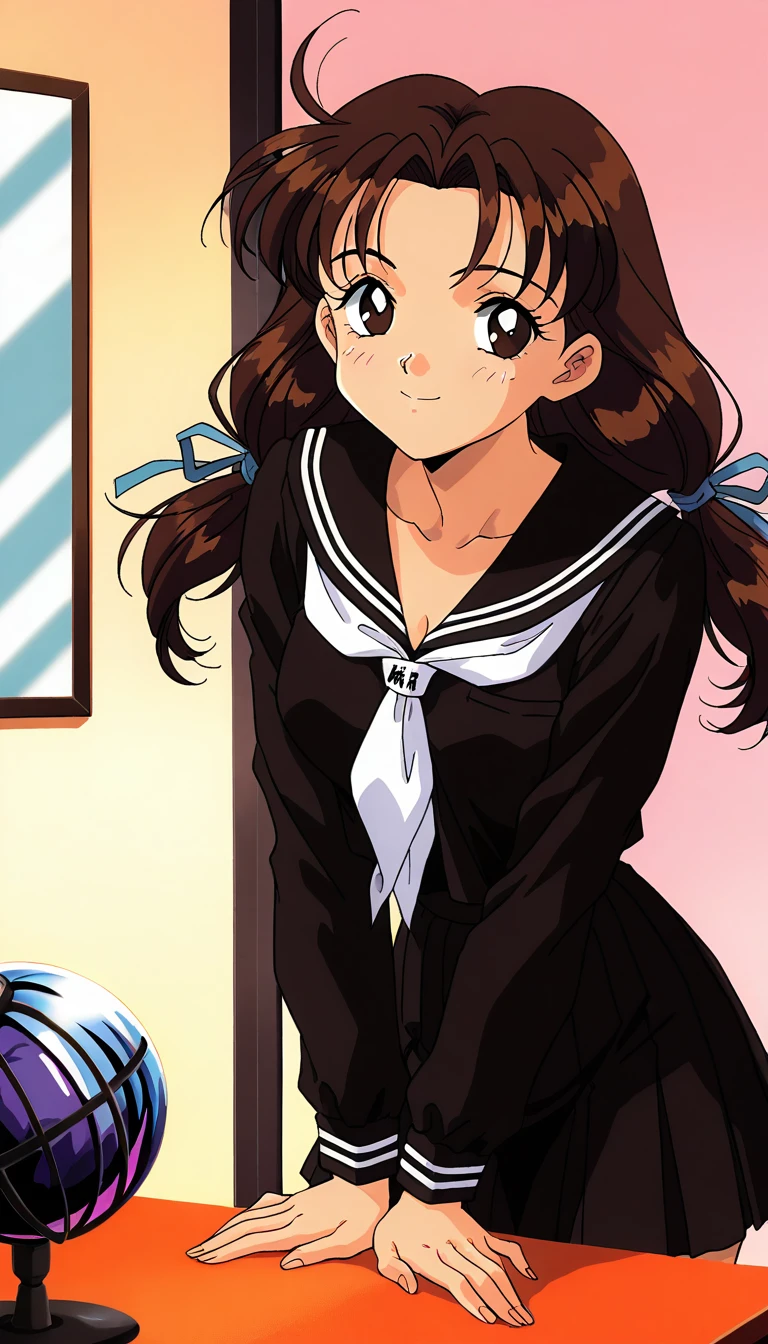 Minegishi_Kyouko, brown hair, ahoge, brown eyes, breasts, long hair, twintails, hair ribbon, blue ribbon, 1990s \(style\),anime coloring,