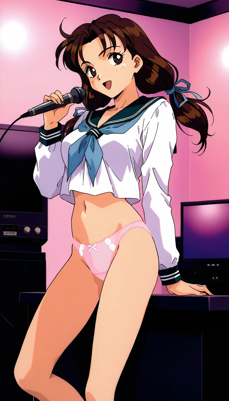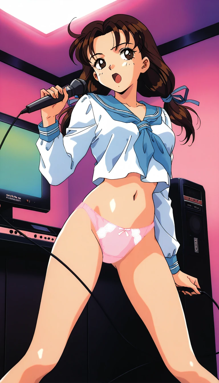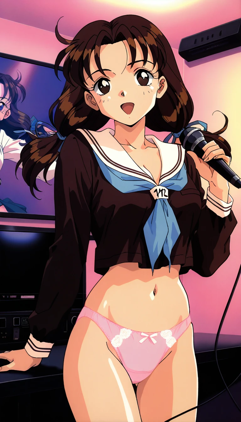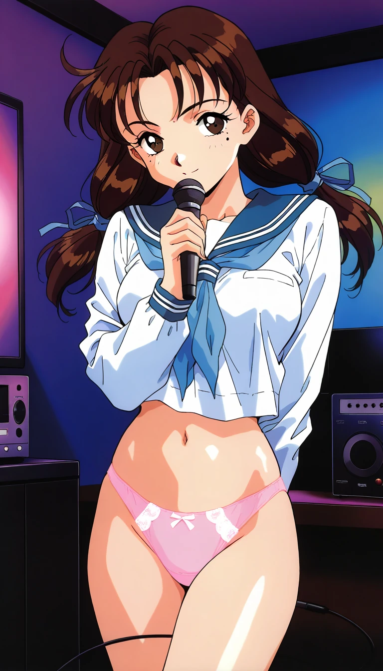 Minegishi_Kyouko, brown hair, ahoge, brown eyes, breasts, long hair, twintails, hair ribbon, blue ribbon, 1990s \(style\),anime coloring,