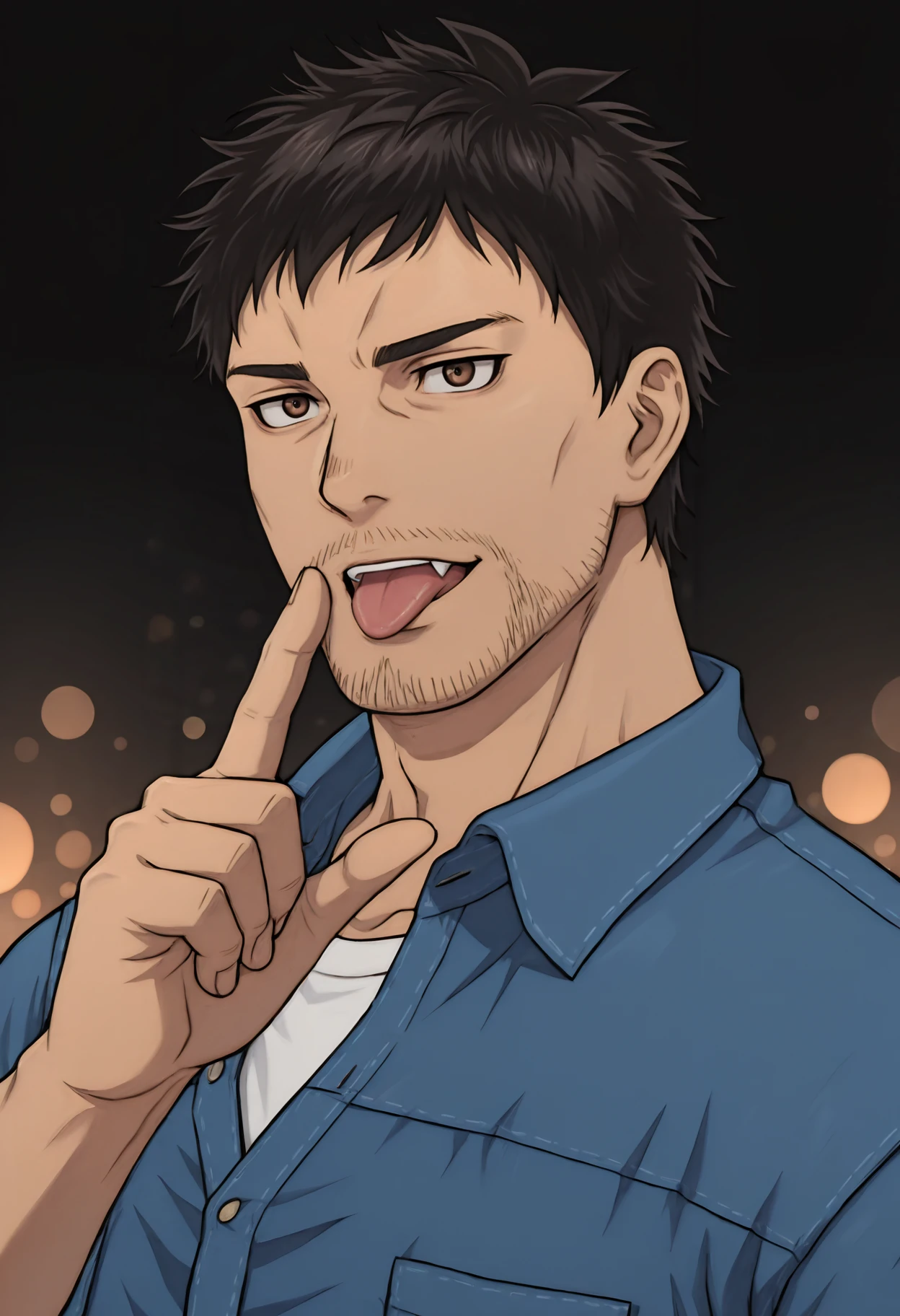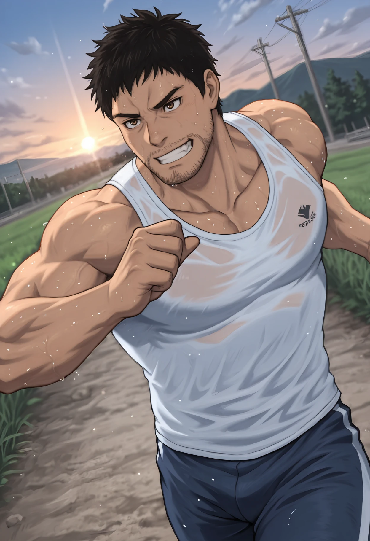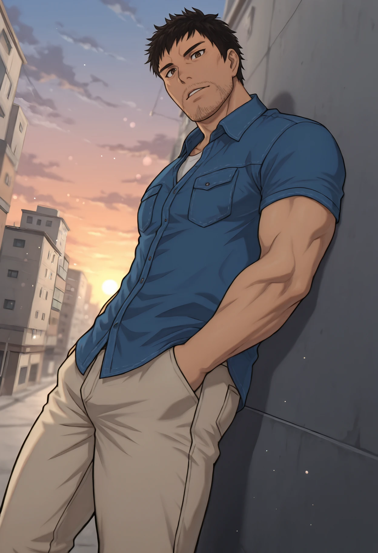 Tanzaburo Tojima, male, man, adult male, brown eyes, short hair, stubble beard, facial hair, strong jawline, serious expression