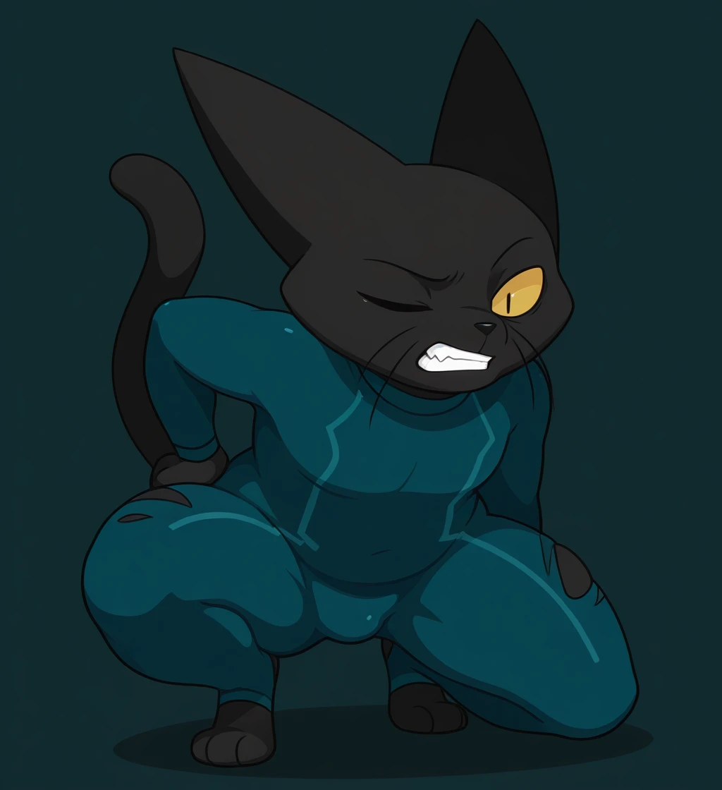 Body: "shinmao, domestic cat, black skin, animal ears, black nose, whiskers, yellow sclera, thin pupils, mature male, semi-anthro, tail, 3 toes"