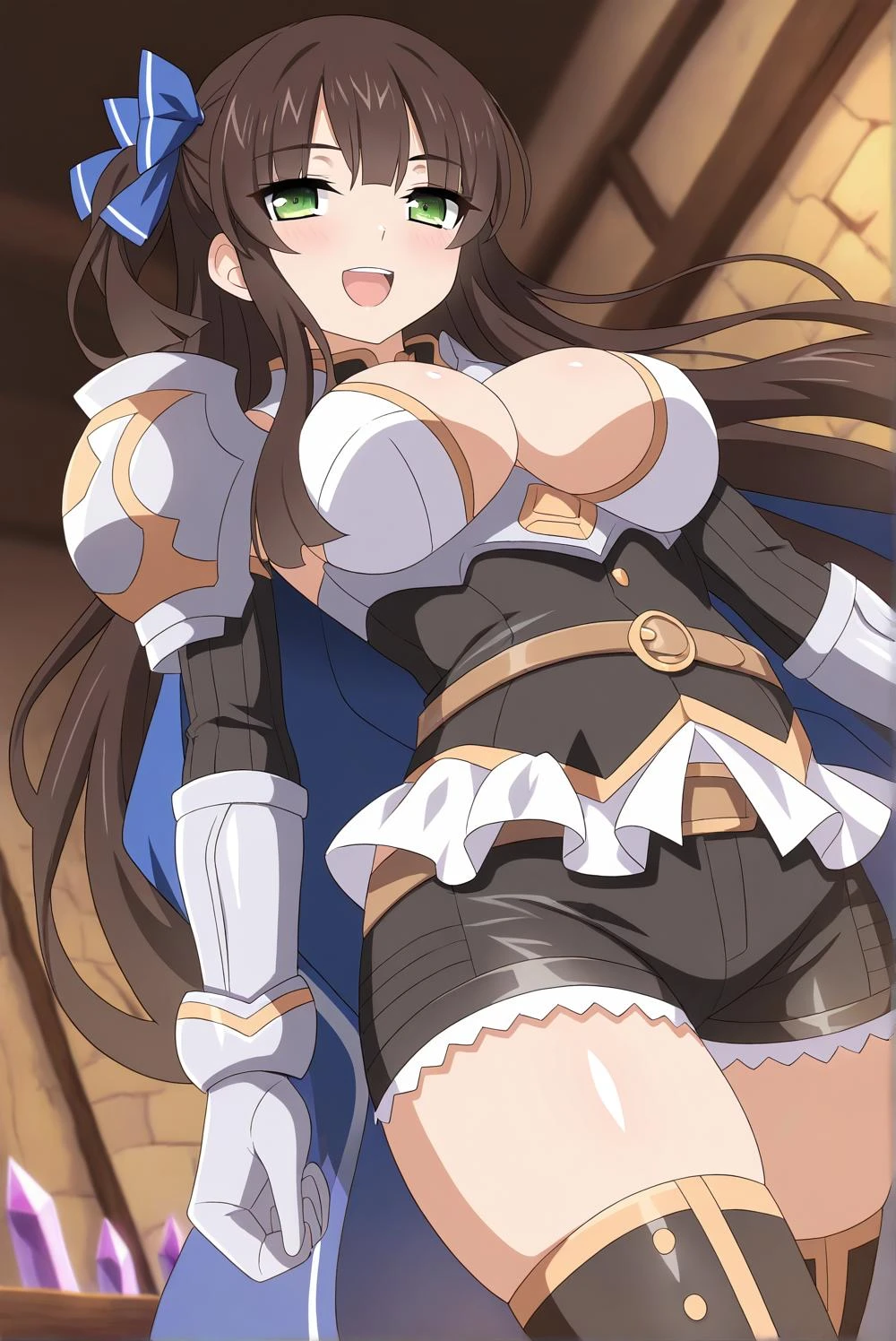 Ceri's appearance: ceri (sakura dungeon), green eyes, long hair, bangs, large breasts, brown hair, hair ribbon, ribbon, hair bow
