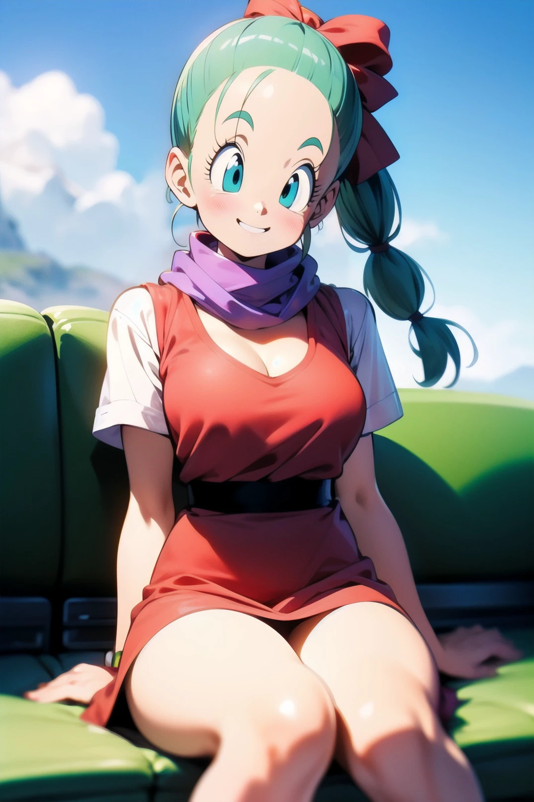 aqua hair, braided ponytail, hair ribbon, forehead, red dress, clothes writing, short sleeves, purple scarf, mini dressaqua hair, bangs, long hair, one side up, hair bobbles, sleeveless, white shirt, shorts, fingerless gloves, elbow pads, goggles around neckI look forward to hearing your thoughts and opinions.