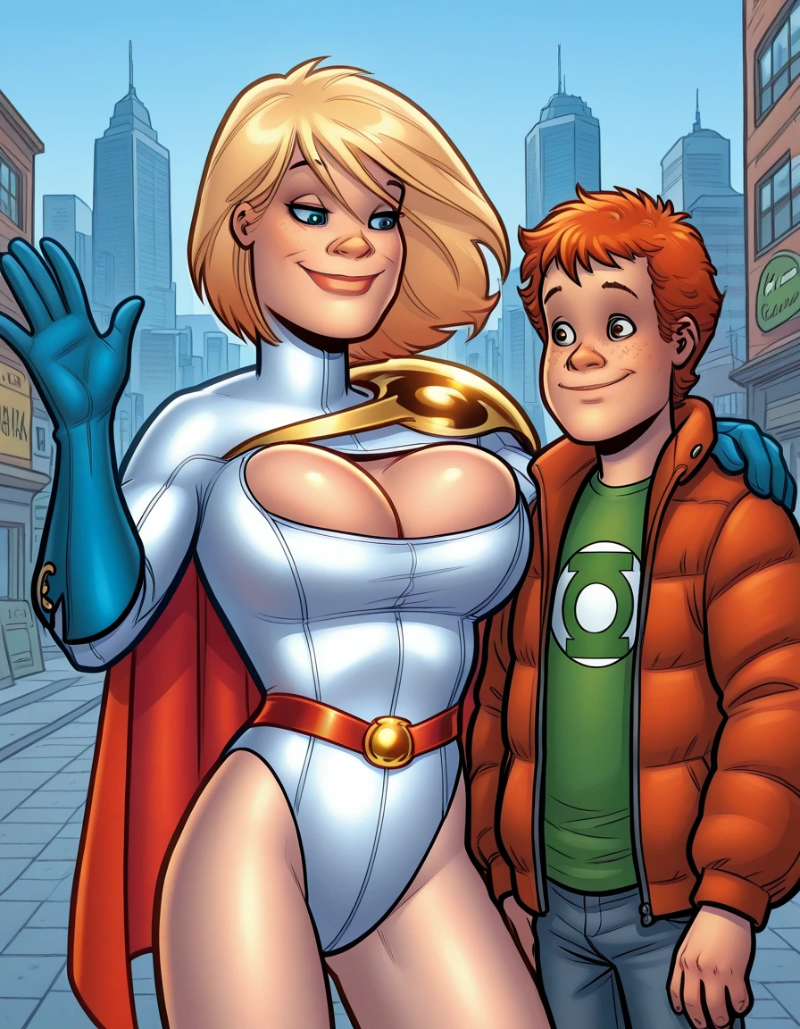• Secondary trigger words (boy first, girl second): 1boy, freckles, jacket, brown eyes, shirt, orange hair, Fisher, jacket, shirt, pants, green shirt 1girl, breasts, blonde hair, blue eyes, cape, leotard, large breasts, red cape, gloves, superhero, cleavage cutout, hetero, lips, blue gloves, clothing cutout, highleg leotard, height difference, highleg, Power Girl, size difference, tall girl