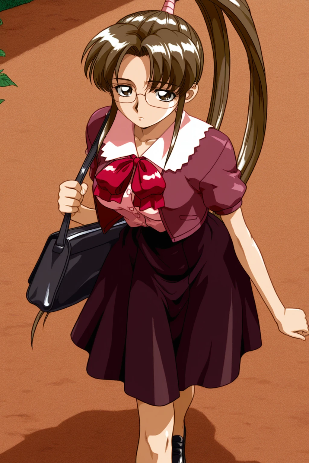 izyi oson,Nozaki Konomi,1girl,solo,brown hair,long hair,glasses,brown eyes,high ponytail,Raspberry cropped jacket,open jacket,short sleeve,pink shirt,small red bow tie,dark pink skirt,black shoulder bag,black Loafers,