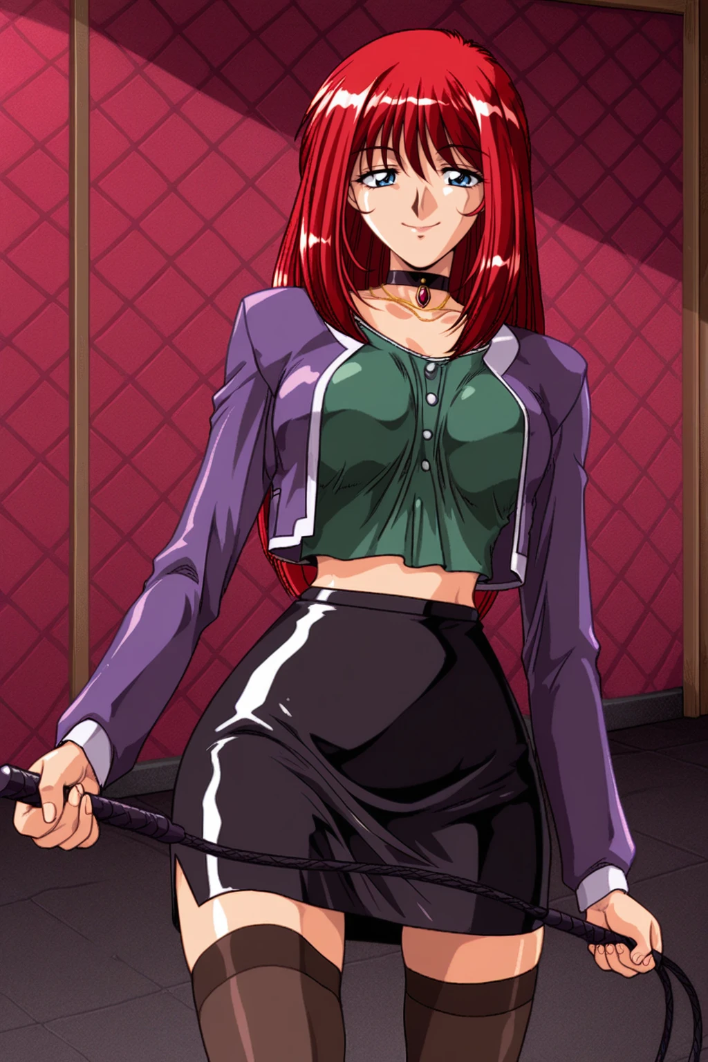 • izyi oson,Namiki Etsuko,1girl,solo,red hair,long hair,blue eyes,jewelry,choker,purple jacket,green shirt,midriff,black pencil skirt,pantyhouse thighhighs,black Ballet flats,