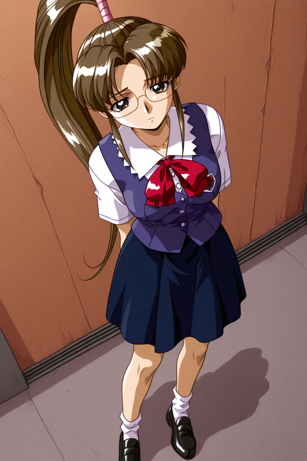 izyi oson,Nozaki Konomi,1girl,solo,brown hair,long hair,glasses,brown eyes,high ponytail,purple vest,white shirt,red bow,collared shirt,dark blue skirt,black Loafers,