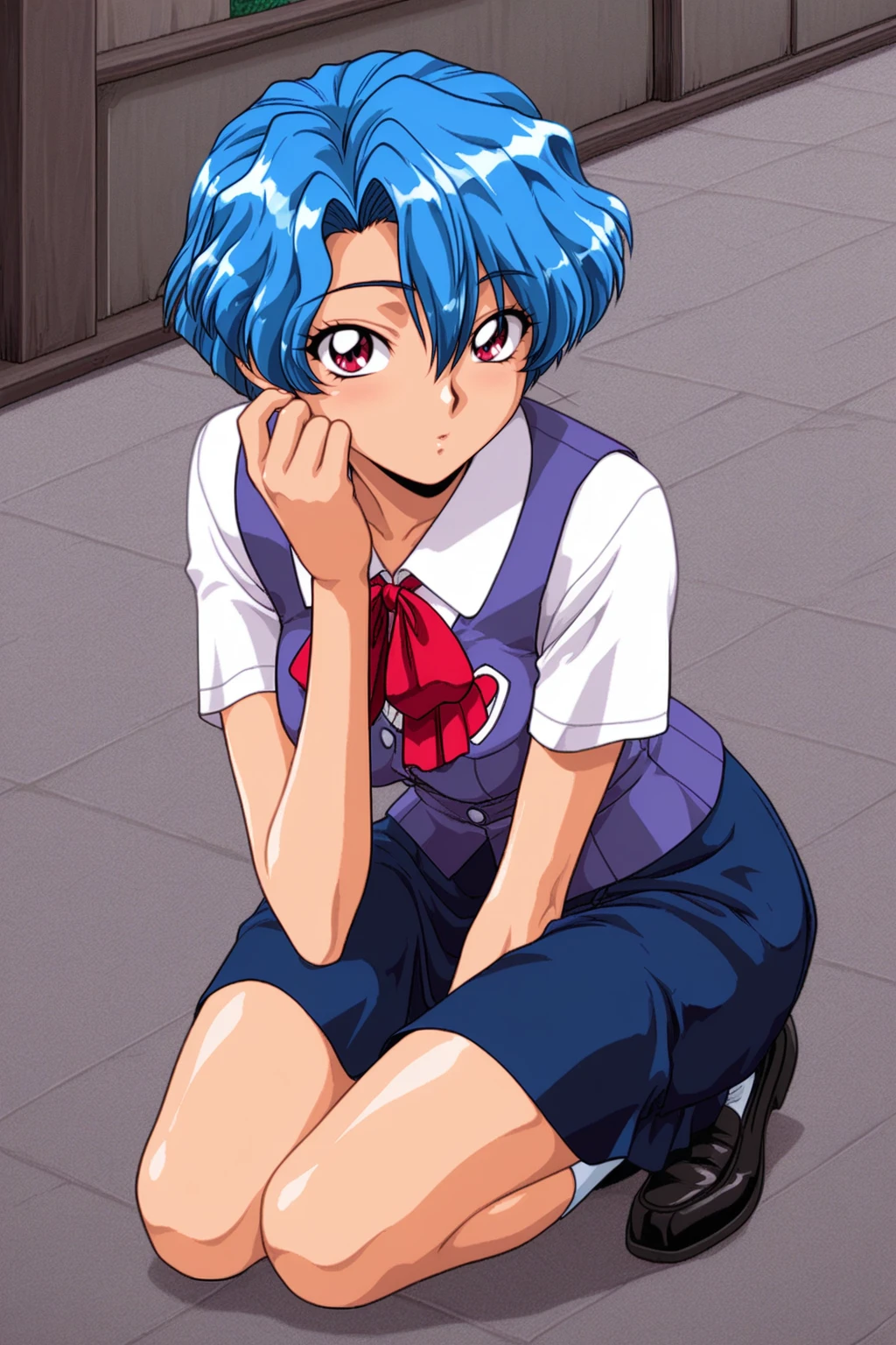 • izyi oson,Namino Marina,1girl,solo,blue hair,short hair,red eyes,purple vest,white shirt,red bow,collared shirt,dark blue skirt,black Loafers,