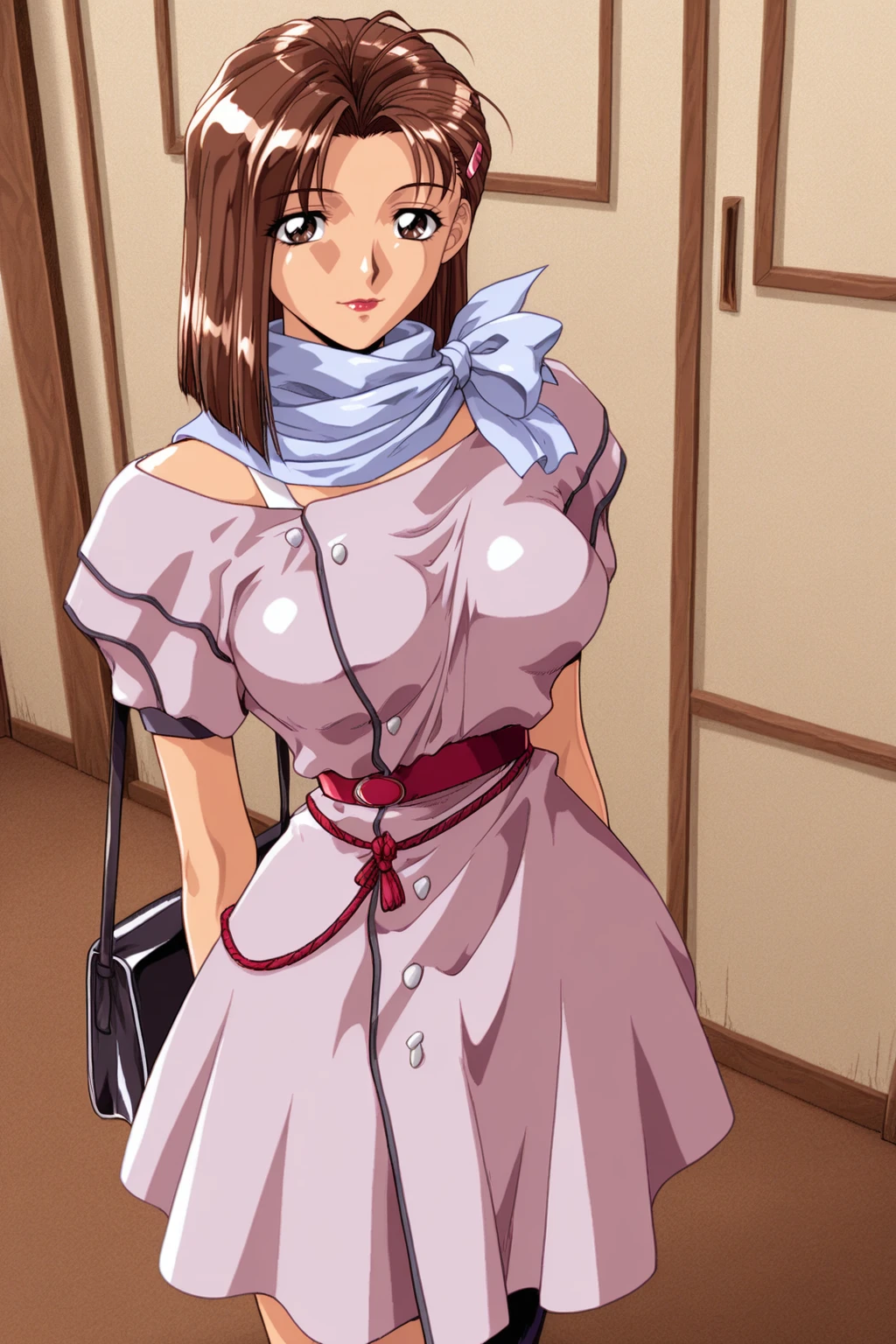 • izyi oson,Kubota Aki,1girl,solo,brown hair,short hair,brown eyes,lipstick,pink hairpin,light blue bow scarf with bow knot,pink shoulder-covered dress,short_sleeves,shoulder bag,red waist thin rope,black heels,