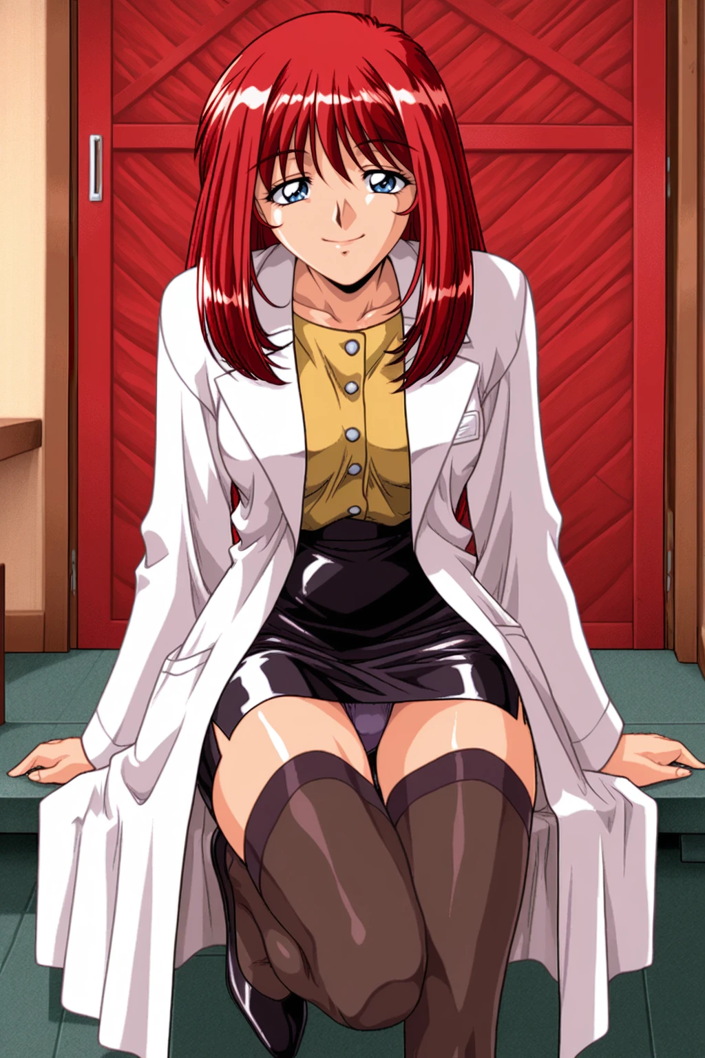 izyi oson,Namiki Etsuko,1girl,solo,red hair,long hair,blue eyes,lab coat,yellow shirt,black pencil skirt,purple panties,pantyhouse thighhighs,black Ballet flats,