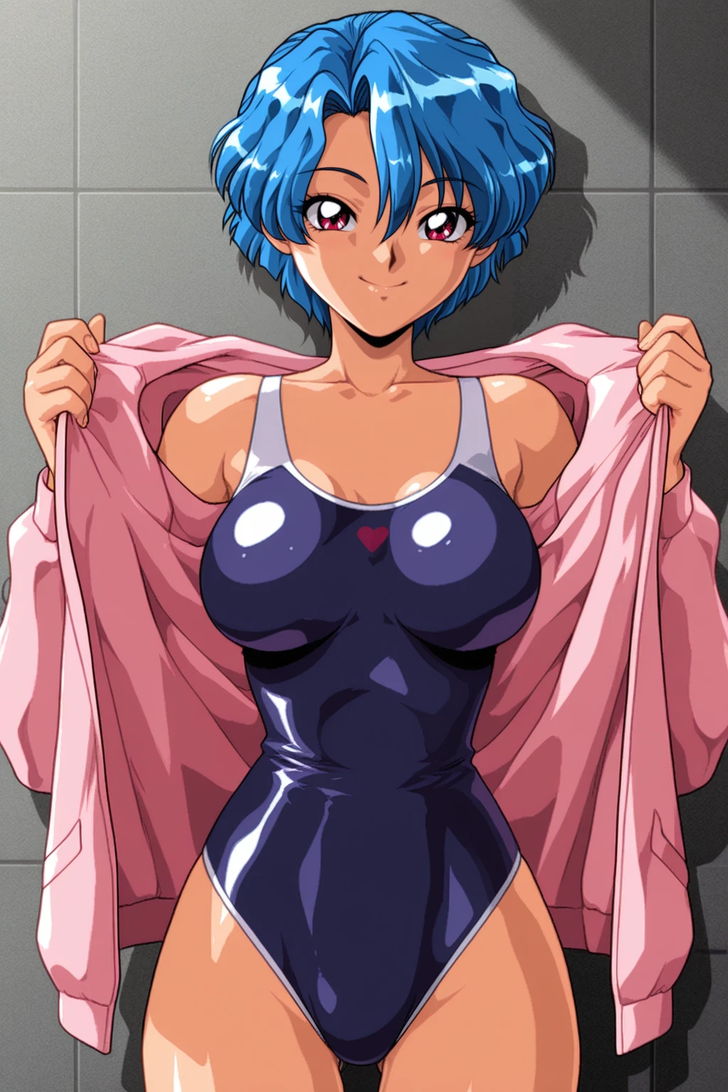 • izyi oson,Namino Marina,1girl,solo,blue hair,short hair,red eyes,pink jacket,open jacket,one-piece swimsuit,barefoot,