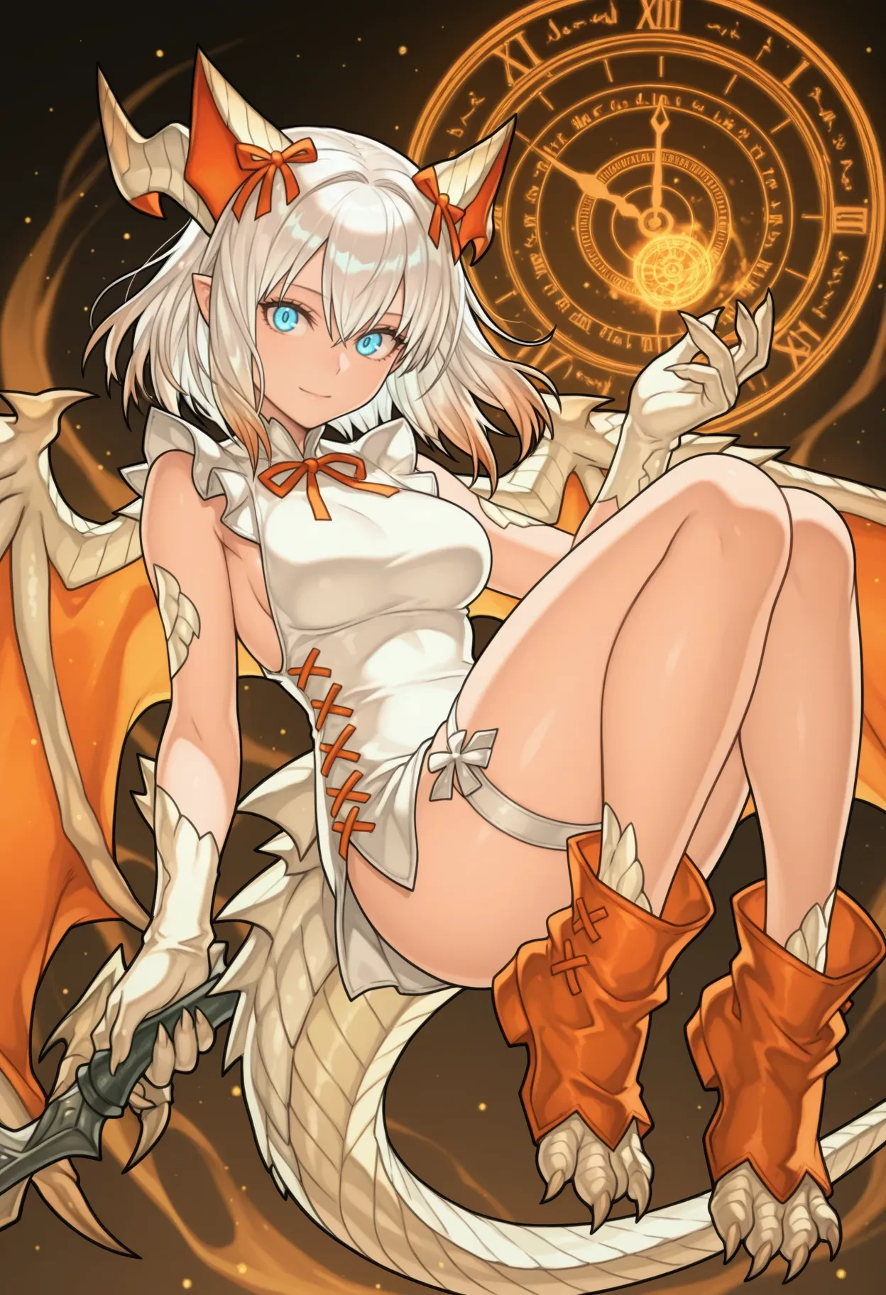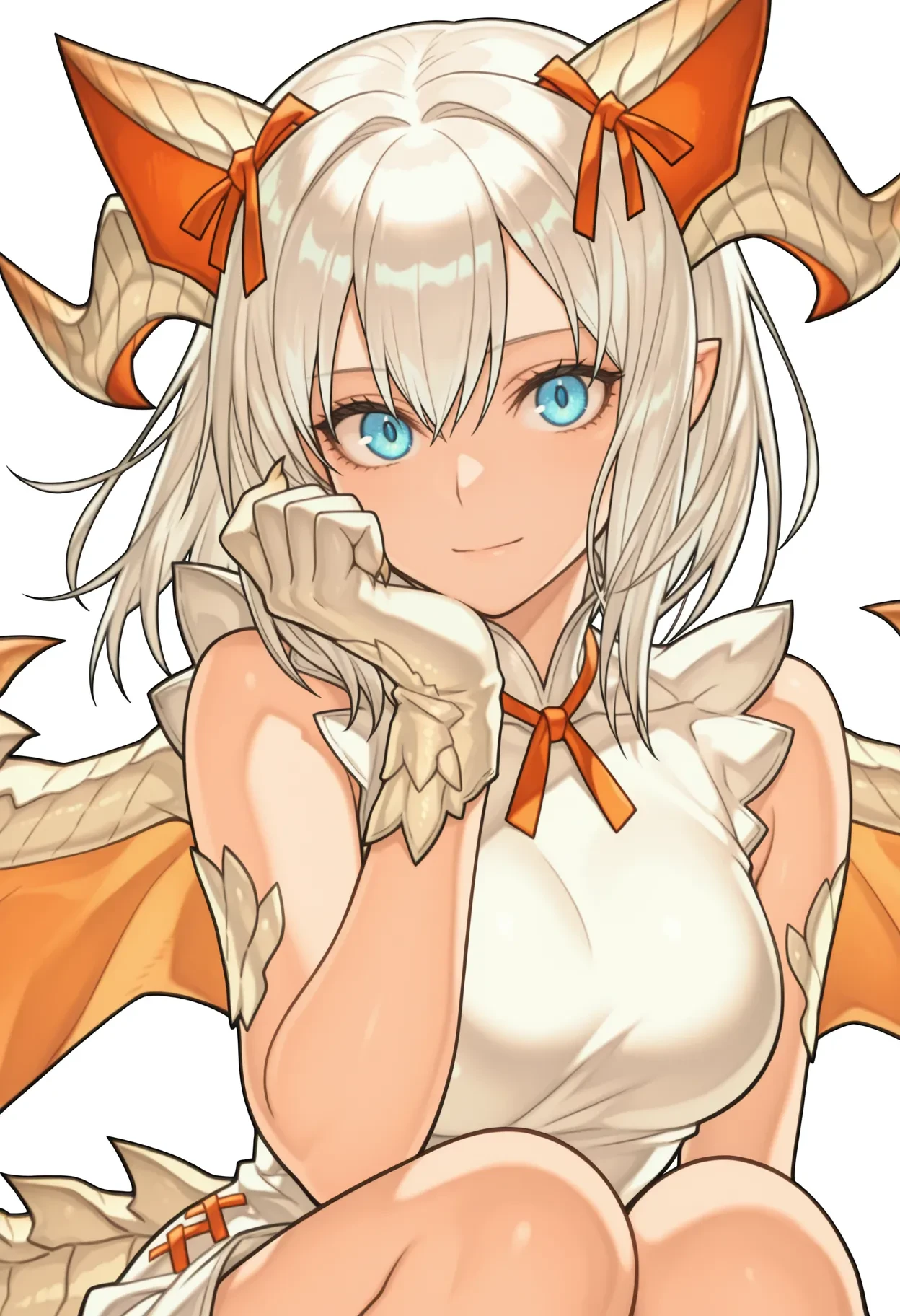 dragon girl,dragon horns,dragon tail,dragon wings,dragon claw,white scales,white hair,medium hair,blue eyes,hair ornament,orange animal ears,fake animal ears,orange hair ribbon,