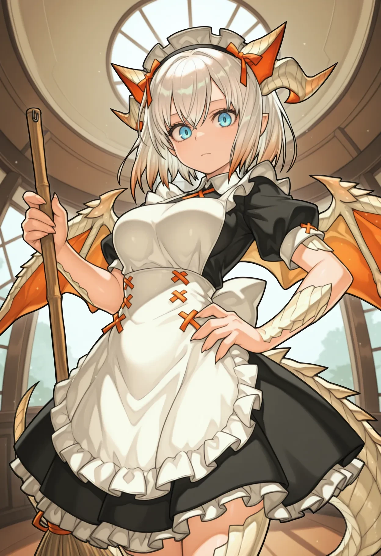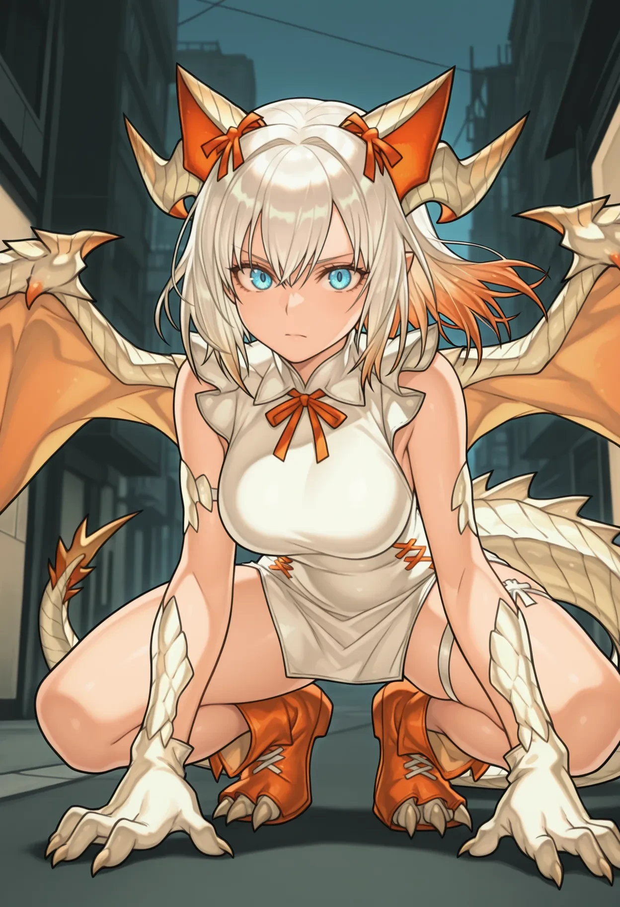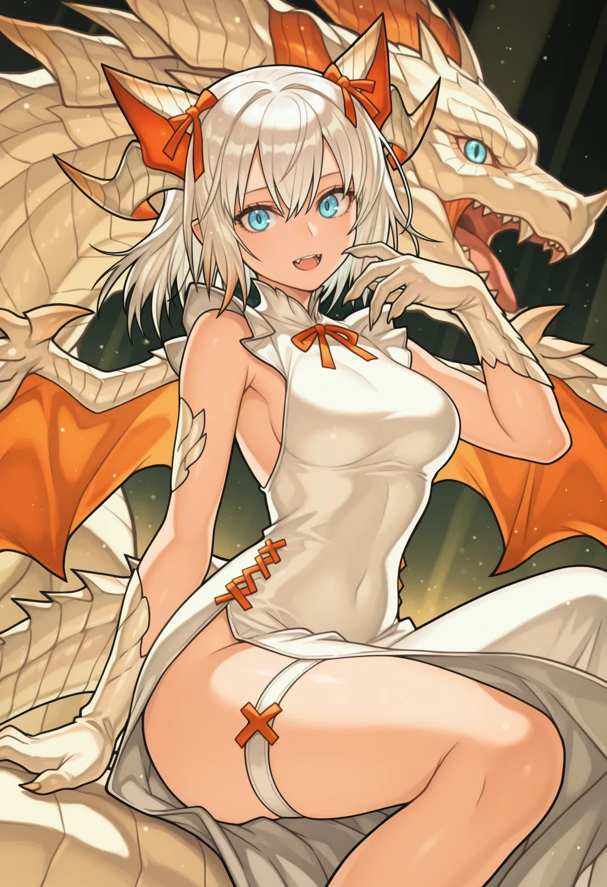 miru001,dragon girl,dragon horns,dragon tail,dragon wings,dragon claw,white scales,white hair,medium hair,blue eyes,hair ornament,orange animal ears,fake animal ears,orange hair ribbon,clothes1: