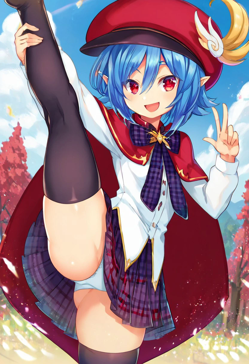 cabbie hat, grey bow, long sleeves, puffy sleeves, red cape, red hat, white shirt, wing symbol, feather on hat, plaid clothes, plaid bow, plaid skirt, pleated skirt, black thighhighs