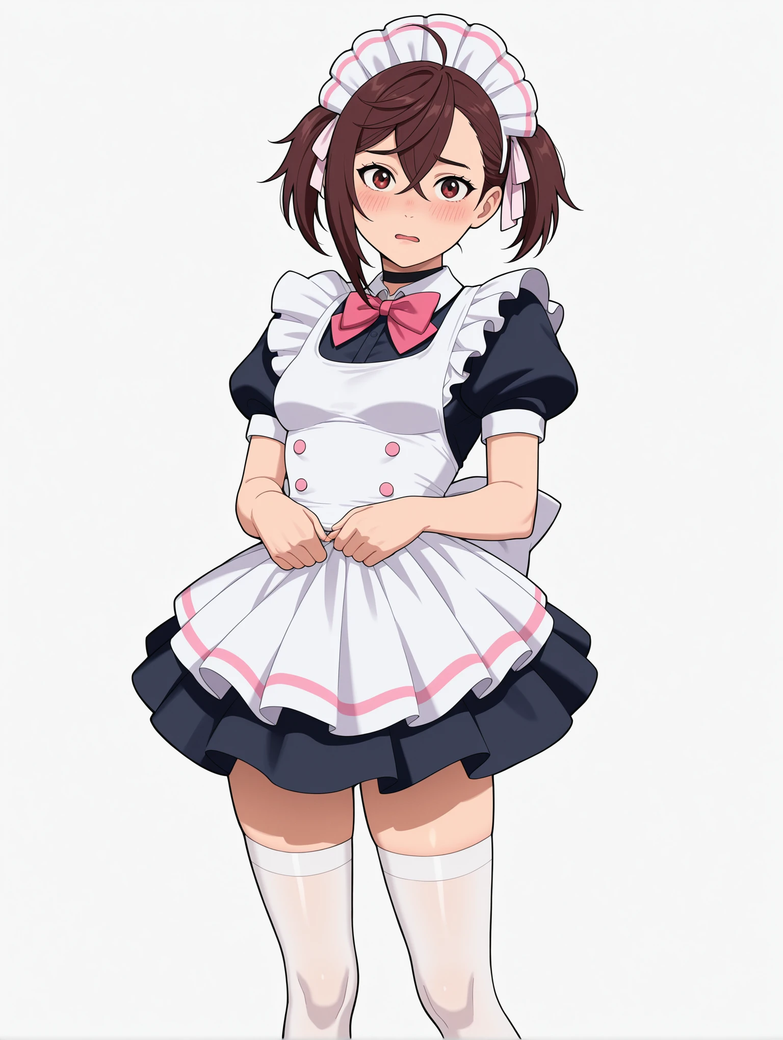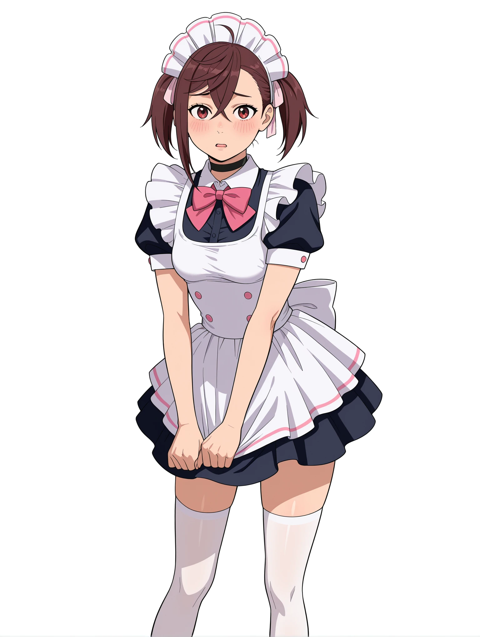 Outfit: maid, enmaided, maid headdress, choker, black choker, ribbon, bowtie, pink bowtie, red bowtie, black dress, dress, short sleeves, puffy sleeves, frills, apron, maid apron, white apron, (white chest apron:1.4), thigh highs, white thigh highs