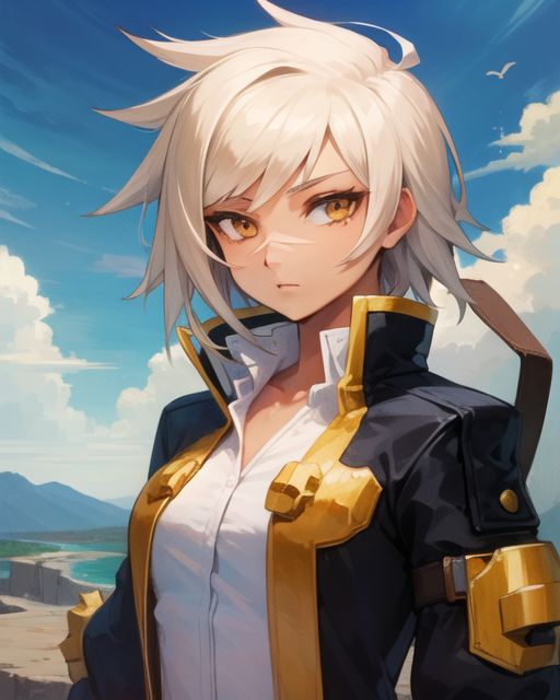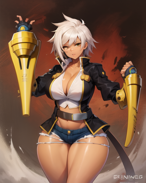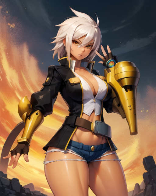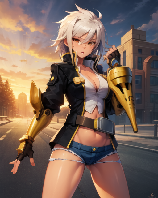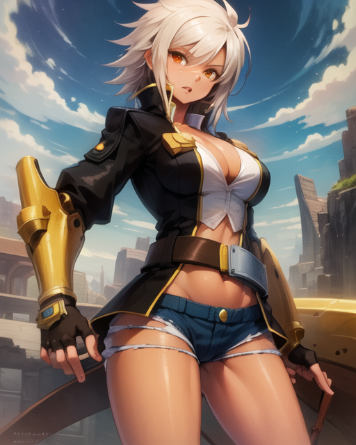 Jacket, gloves, fingerless gloves, denim, shorts, cleavage, navel, micro shorts, cutoffs, thighs, gauntlets, scar, scar on face