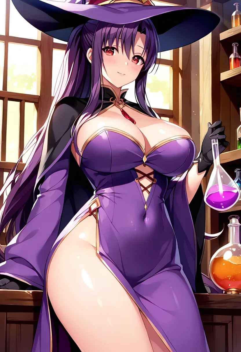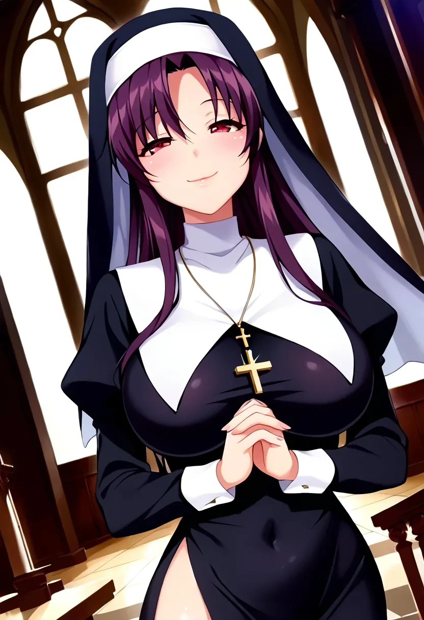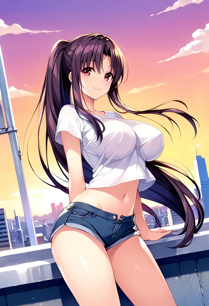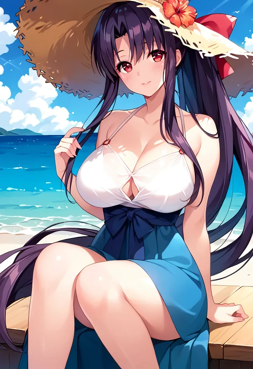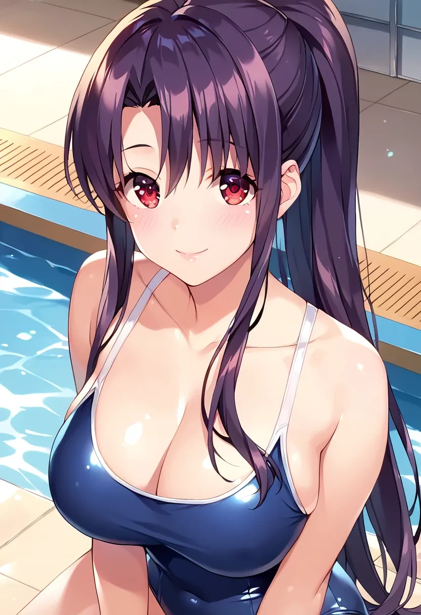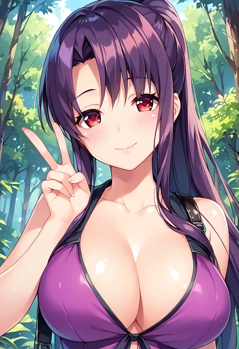 Kitamura Natsuki, long hair, black hair, purple hair, sidelocks, red eyes, ponytail,