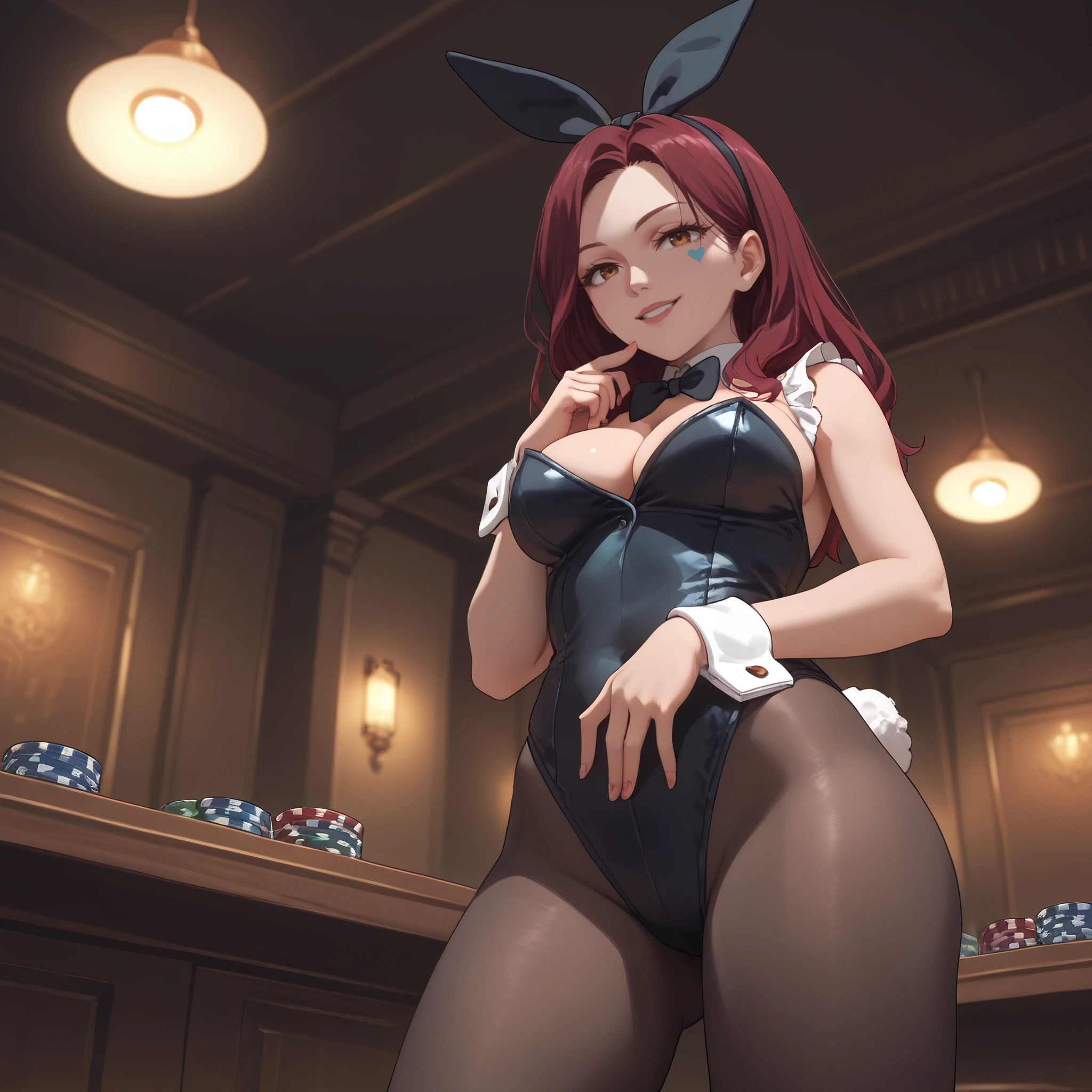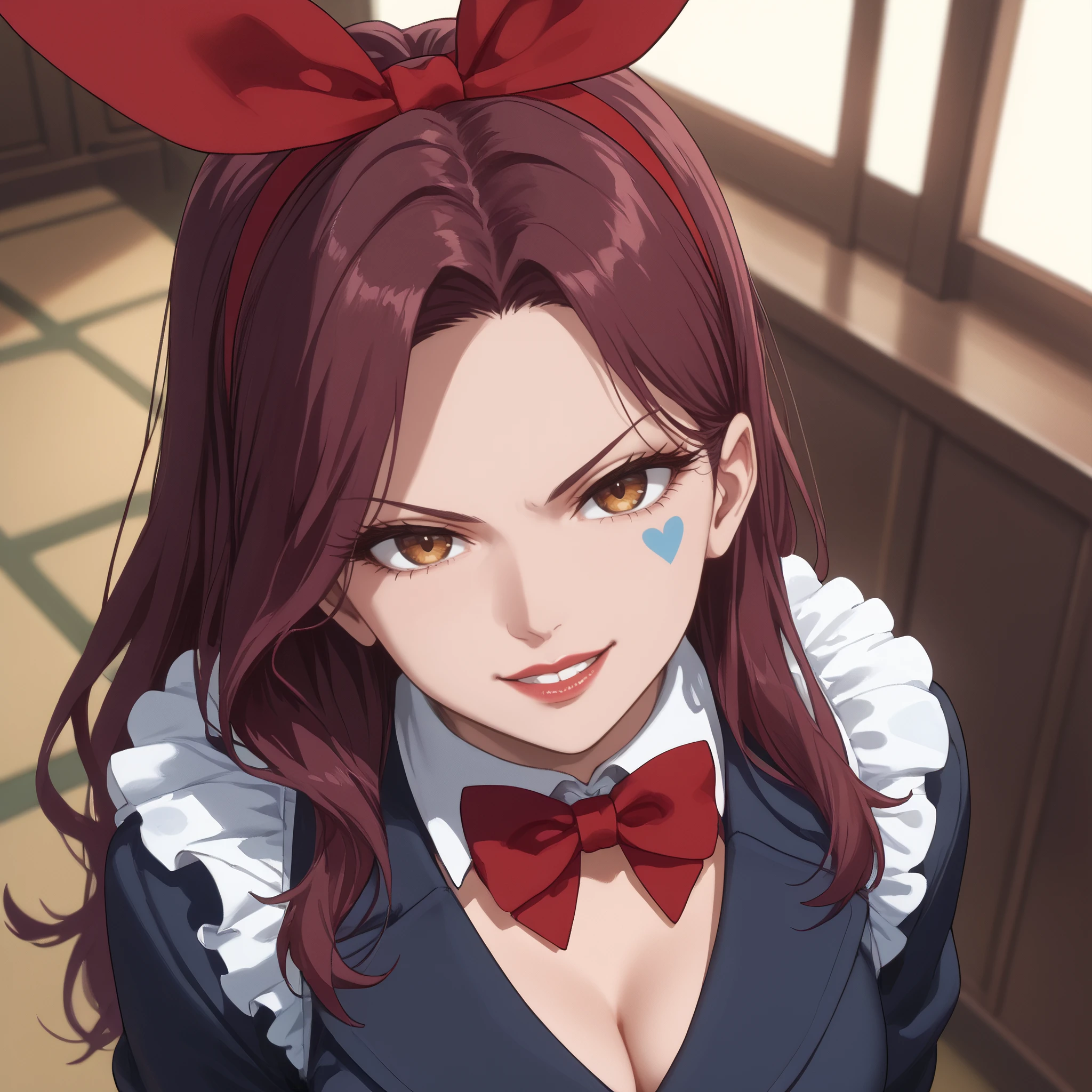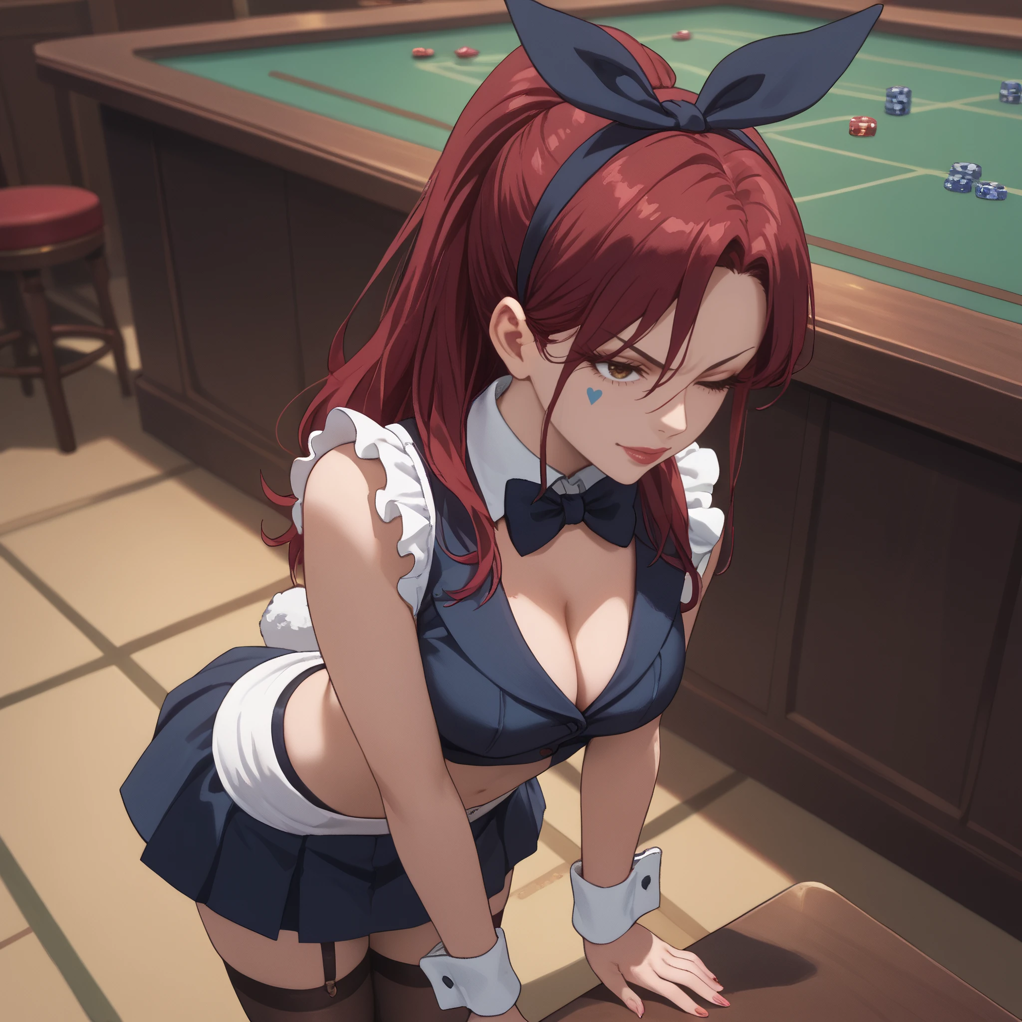 AMWCardDealer, long hair, bow, bowtie, hairband, ribbon, red hair, animal ears, hair ribbon, rabbit ears, eyelashes, brown eyes, ponytail,