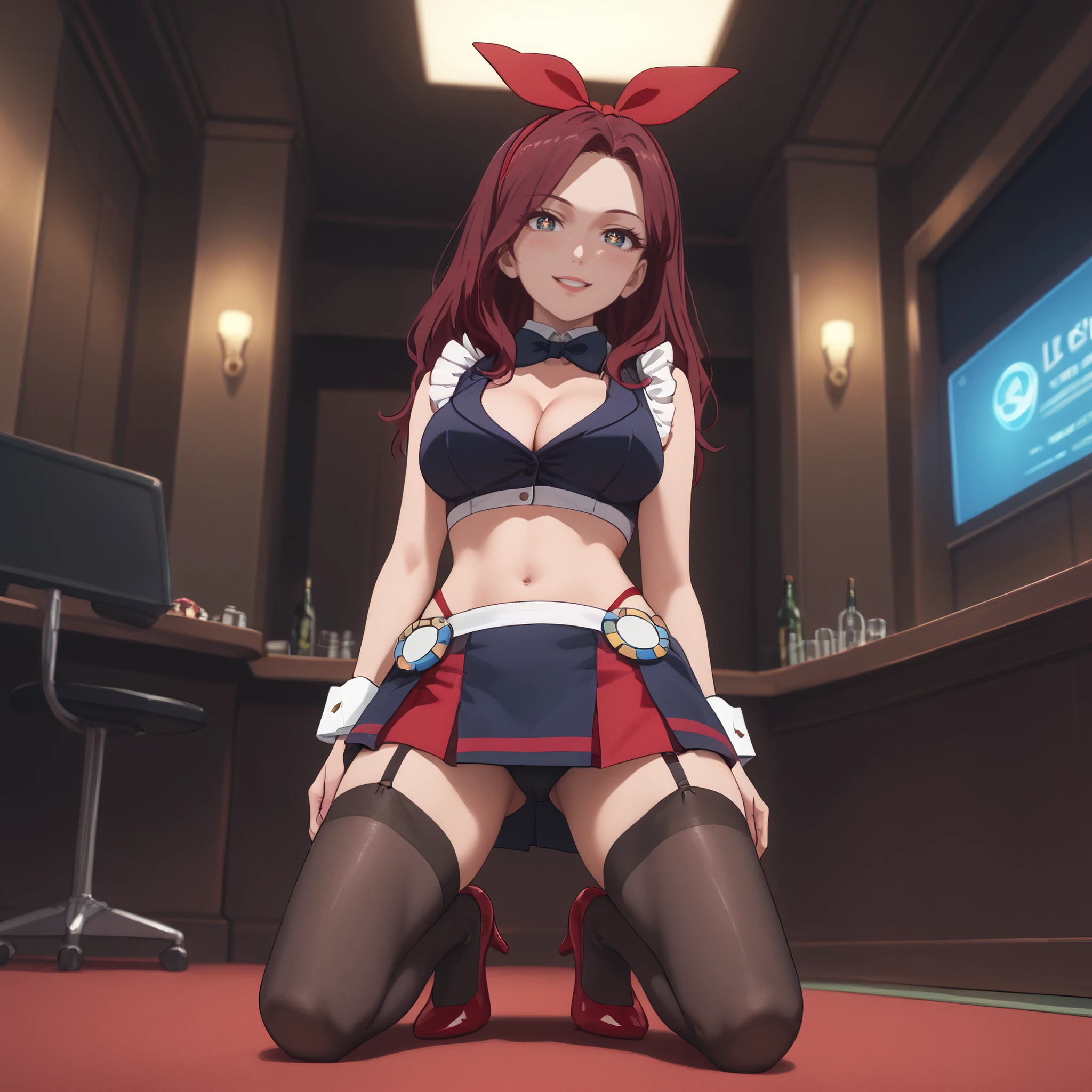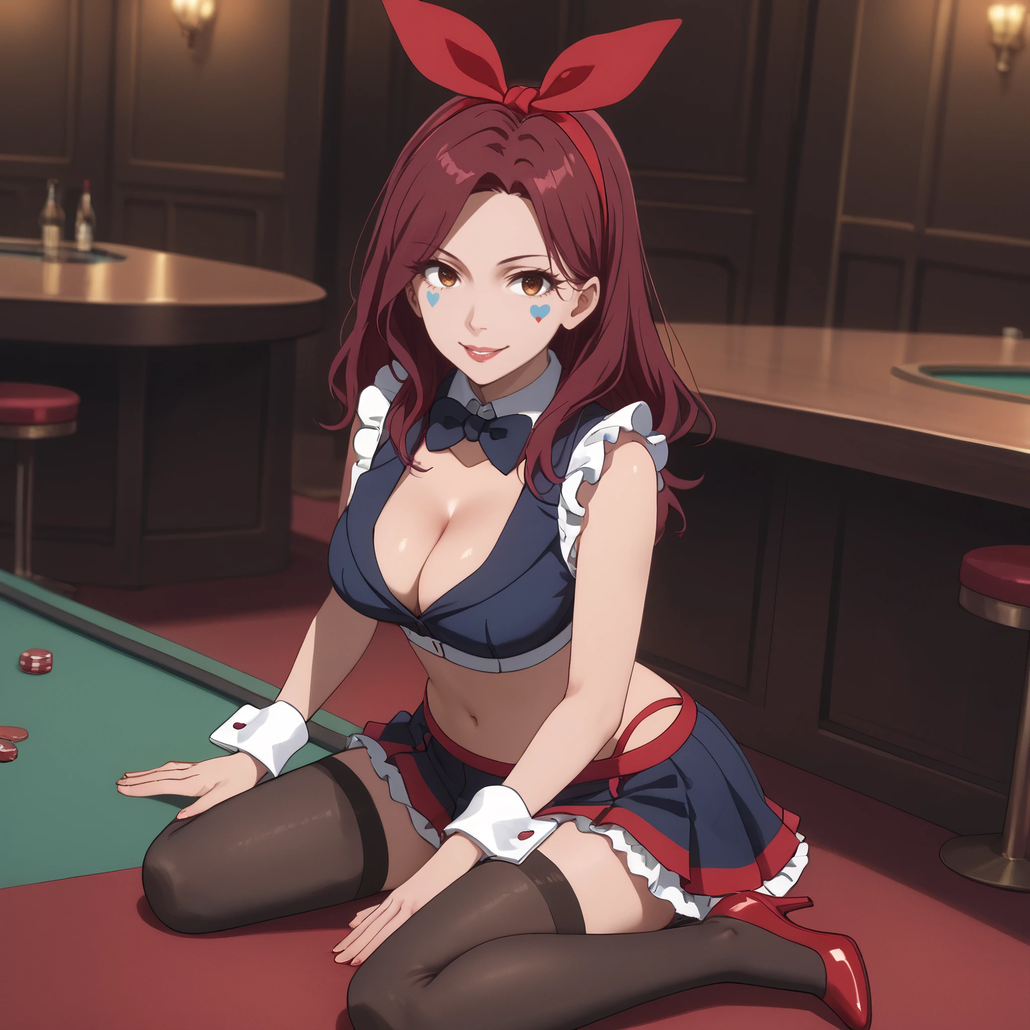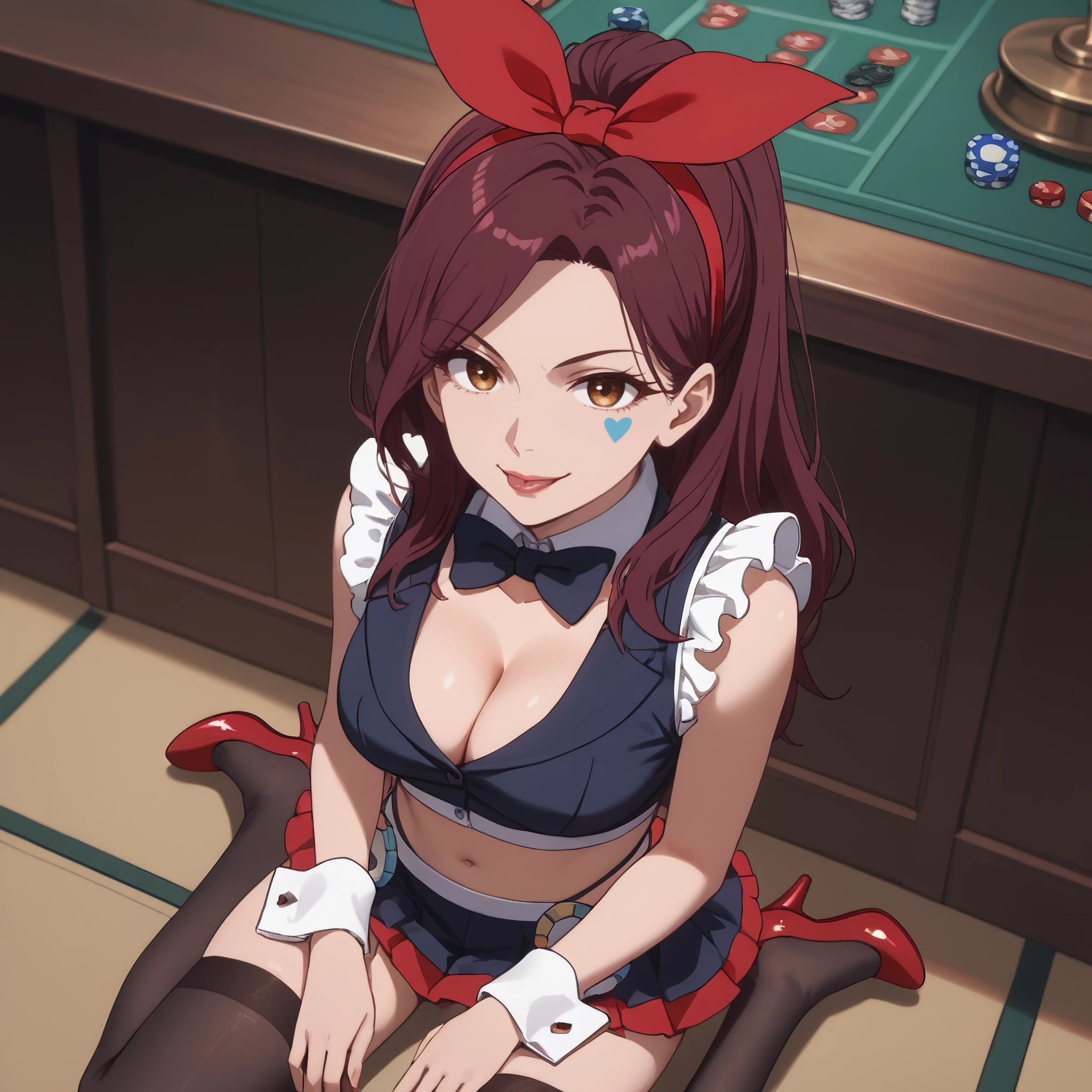 cleavage, frills, midriff, navel, crop top, wrist cuffs, detached collar, sleeveless, black skirt, black thighhighs, red heels,