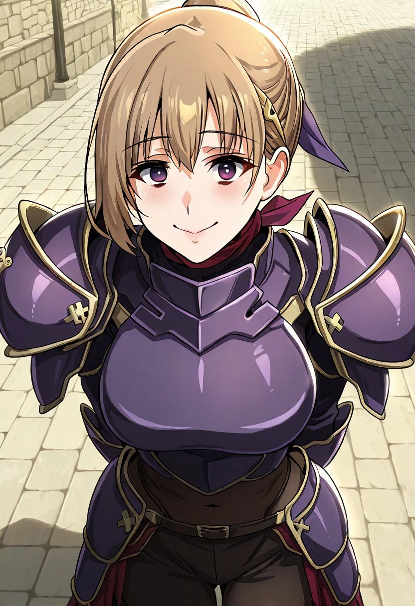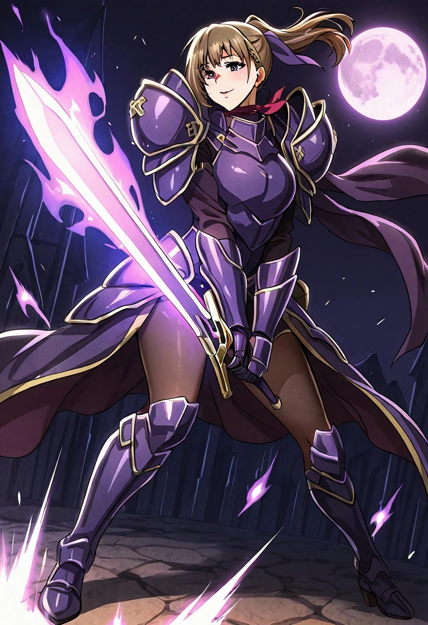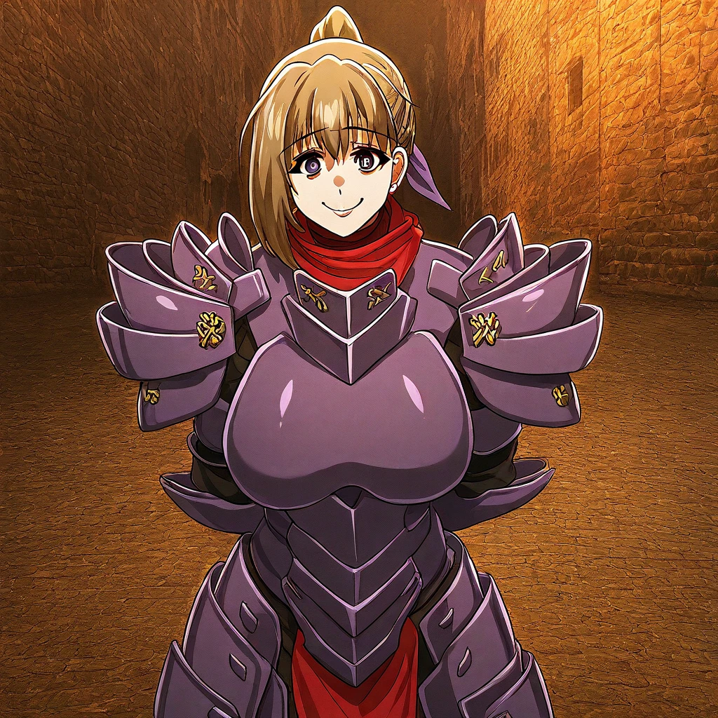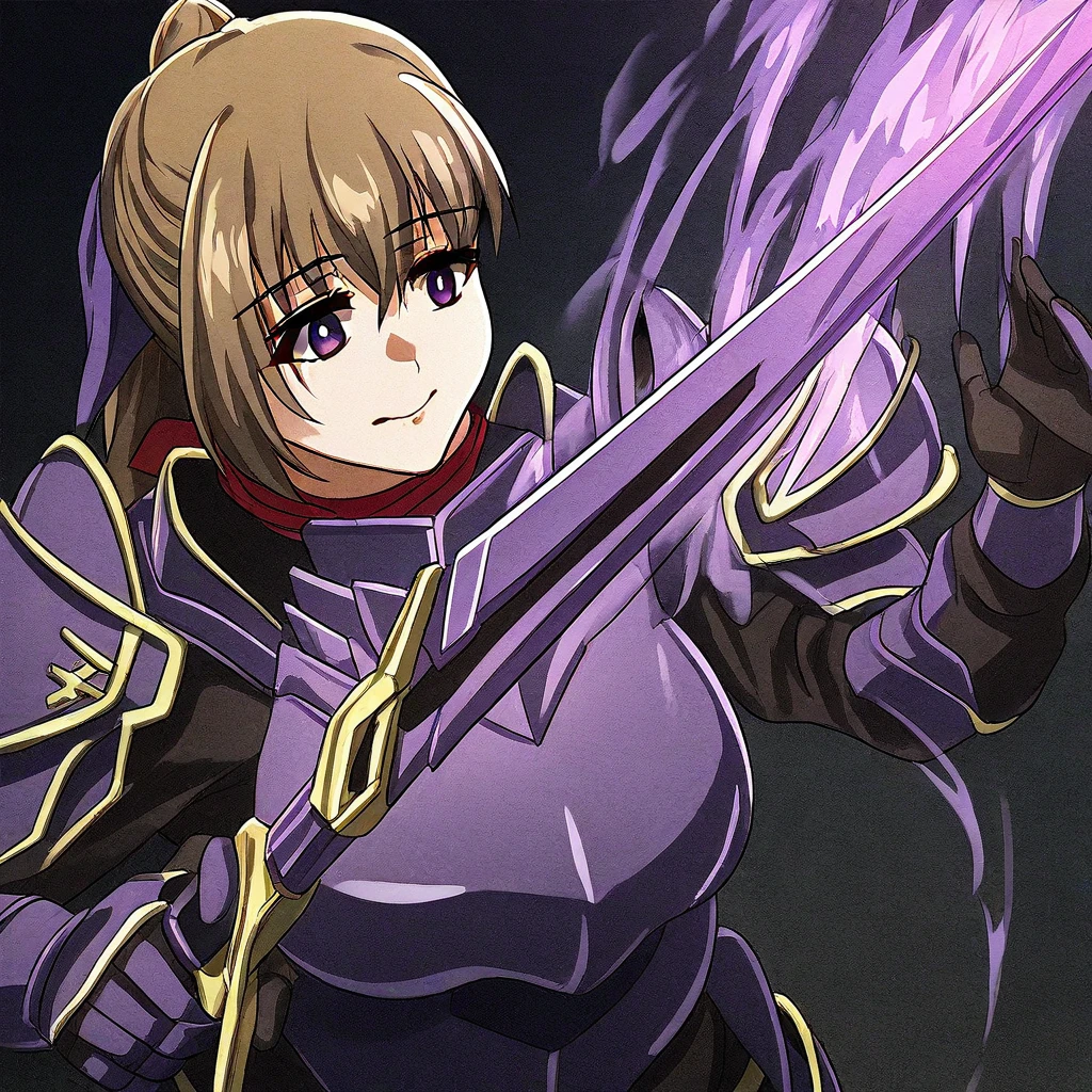 1. ((purple full body armor, red neck-scarf, purple hair tie, purple huge shoulder pad armors, purple armor gloves, gold hair clip, )) + huge battle axe, + long sword, + purple helmet,