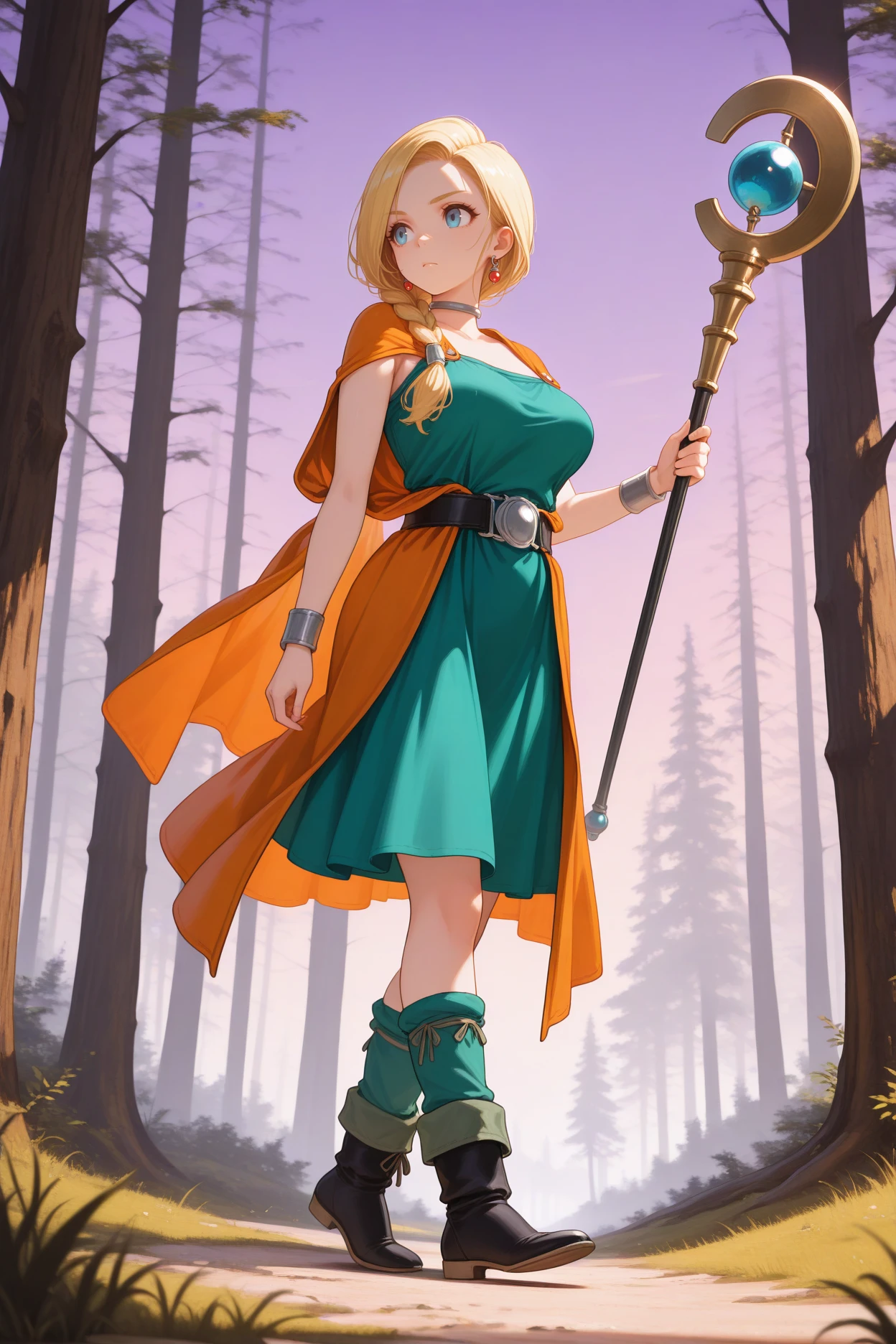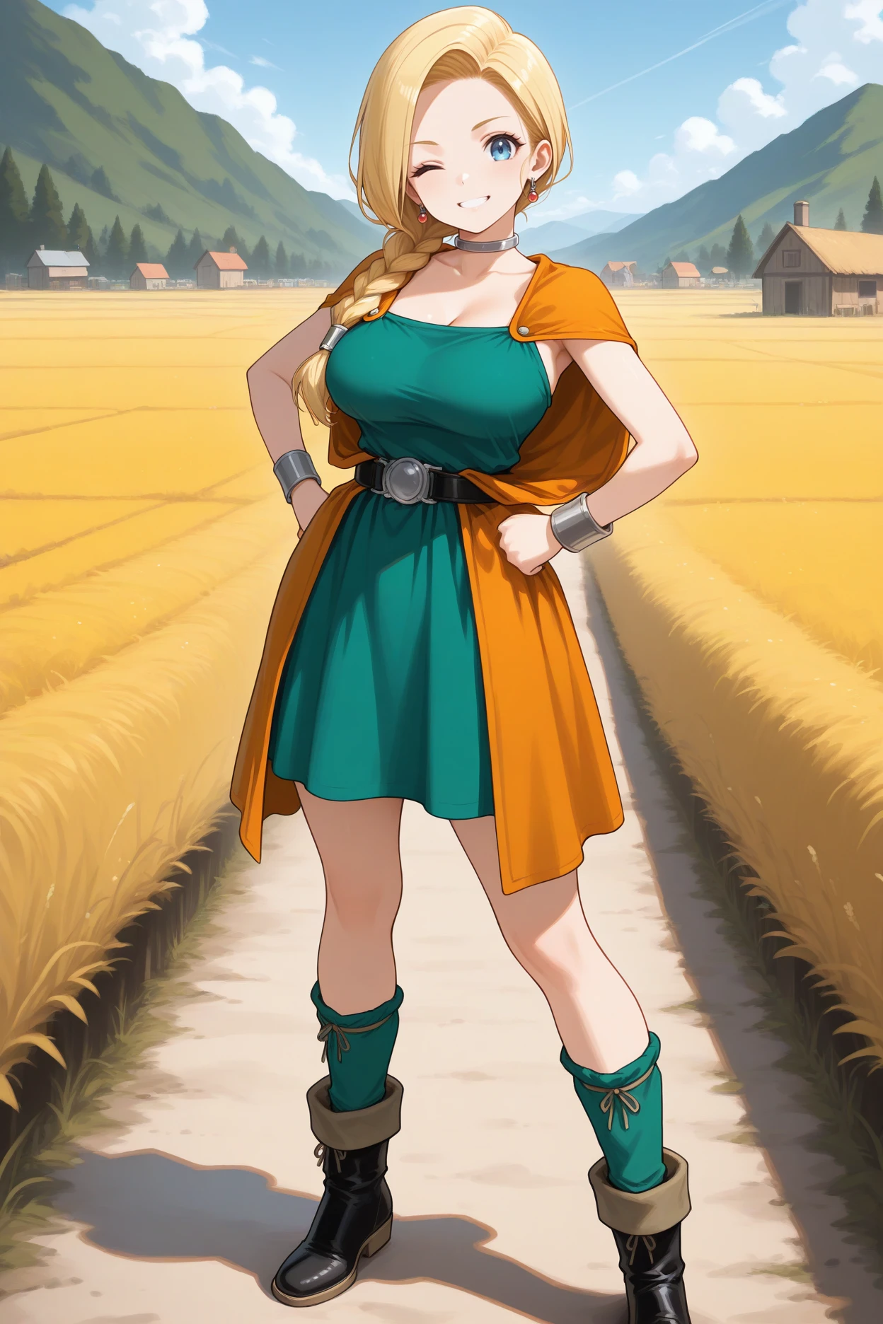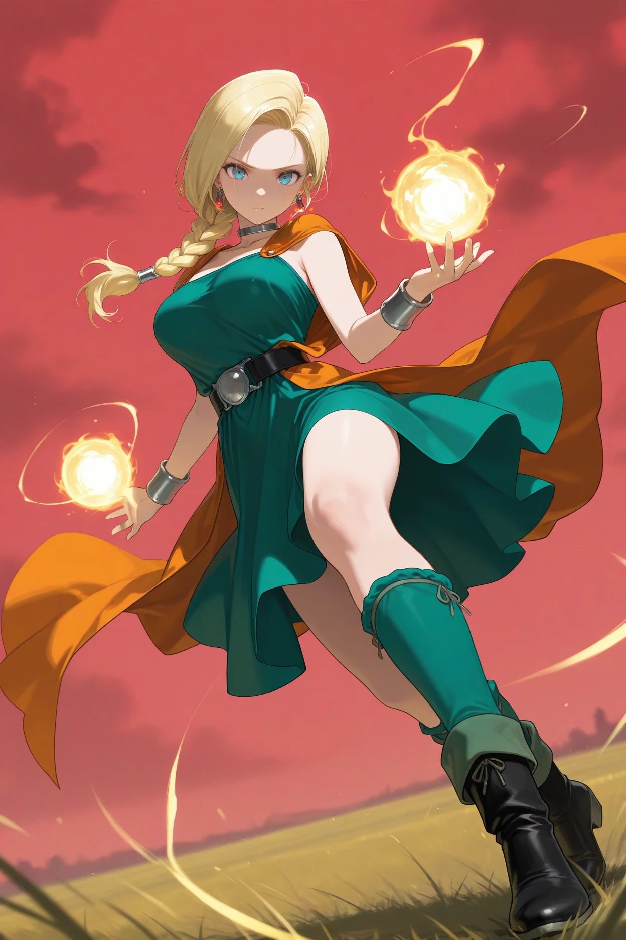 Add "red earrings, choker, orange cape, green dress, sleeveless dress, belt, bracelet, green socks, knee socks, black boots, ankle boots" for her typical look.