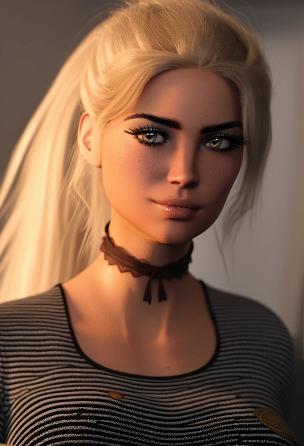basic prompt: ocean_style, summersgone, bella_von_halen, bella, visual_novell, 1girl, solo, long hair, blonde hair, yellow eyes, freckles, ponytail, lips, medium breasts
