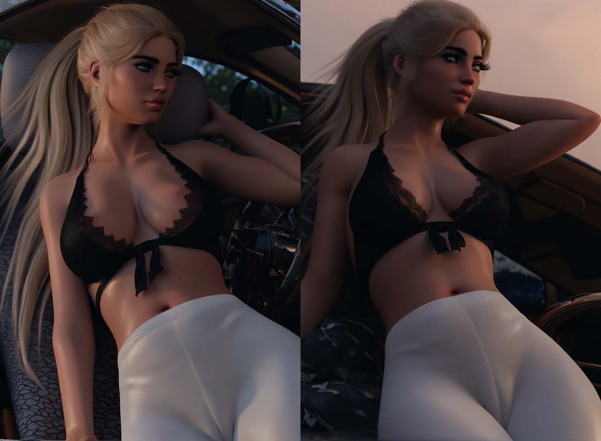 Also has some nice options with lying on/in her car, motor vehicle, ground vehicle, car interior