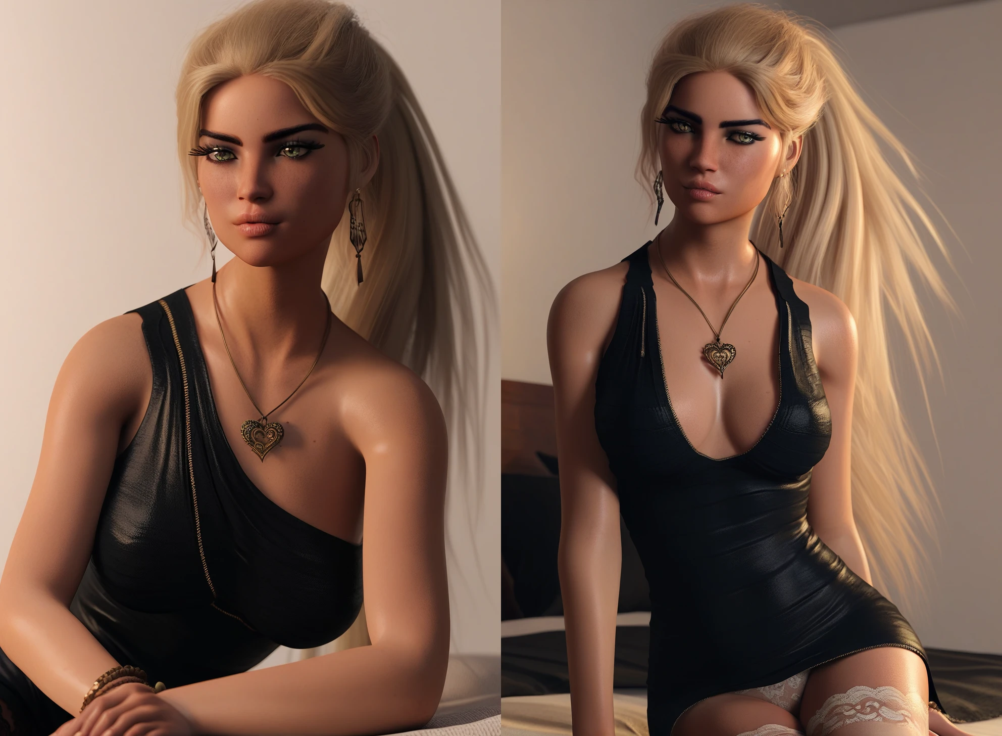 black dress, white lace-trimmed legwear, jewelry, necklace