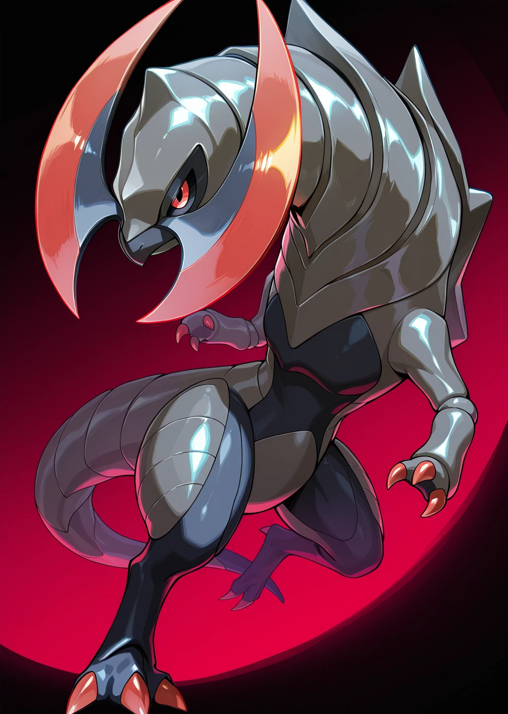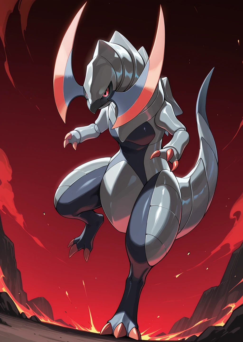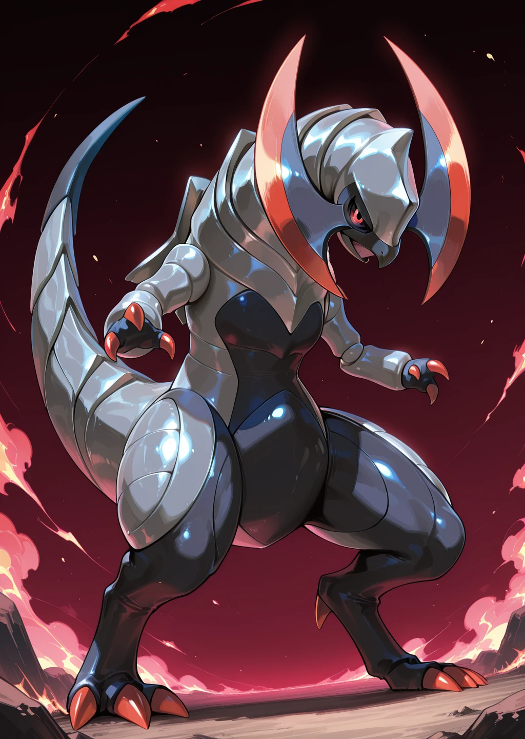 Prompts: haxorus, pokemon (creature), red eyes, colored sclera,