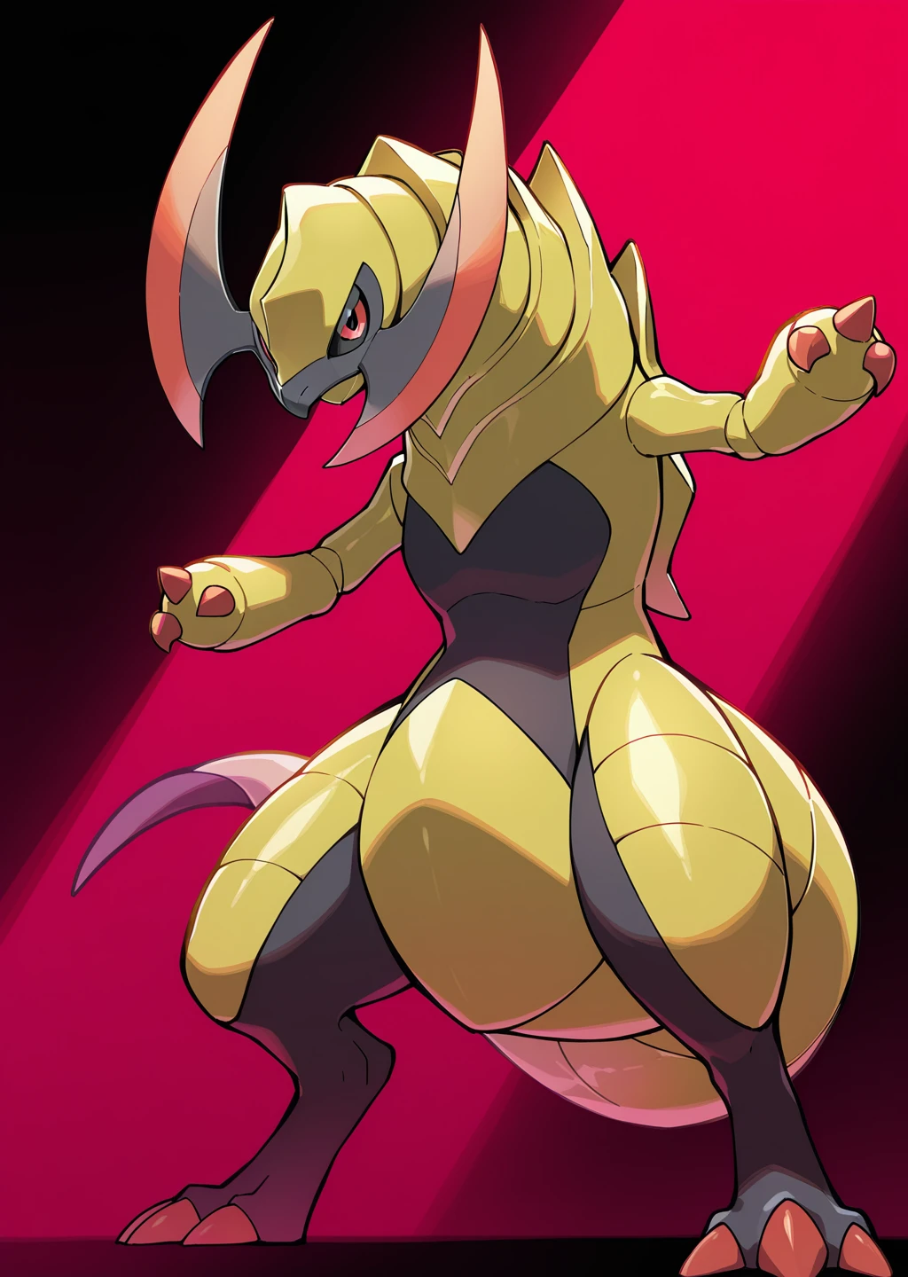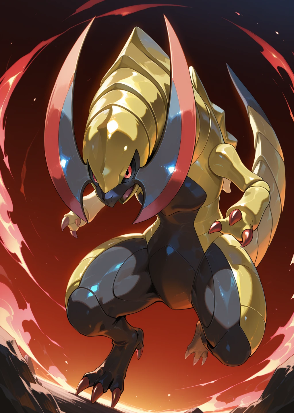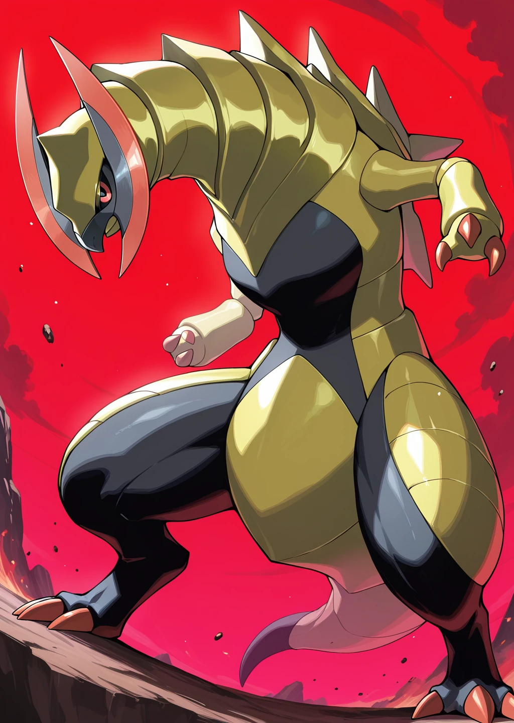 Prompts: haxorus, pokemon (creature), red eyes, colored sclera,