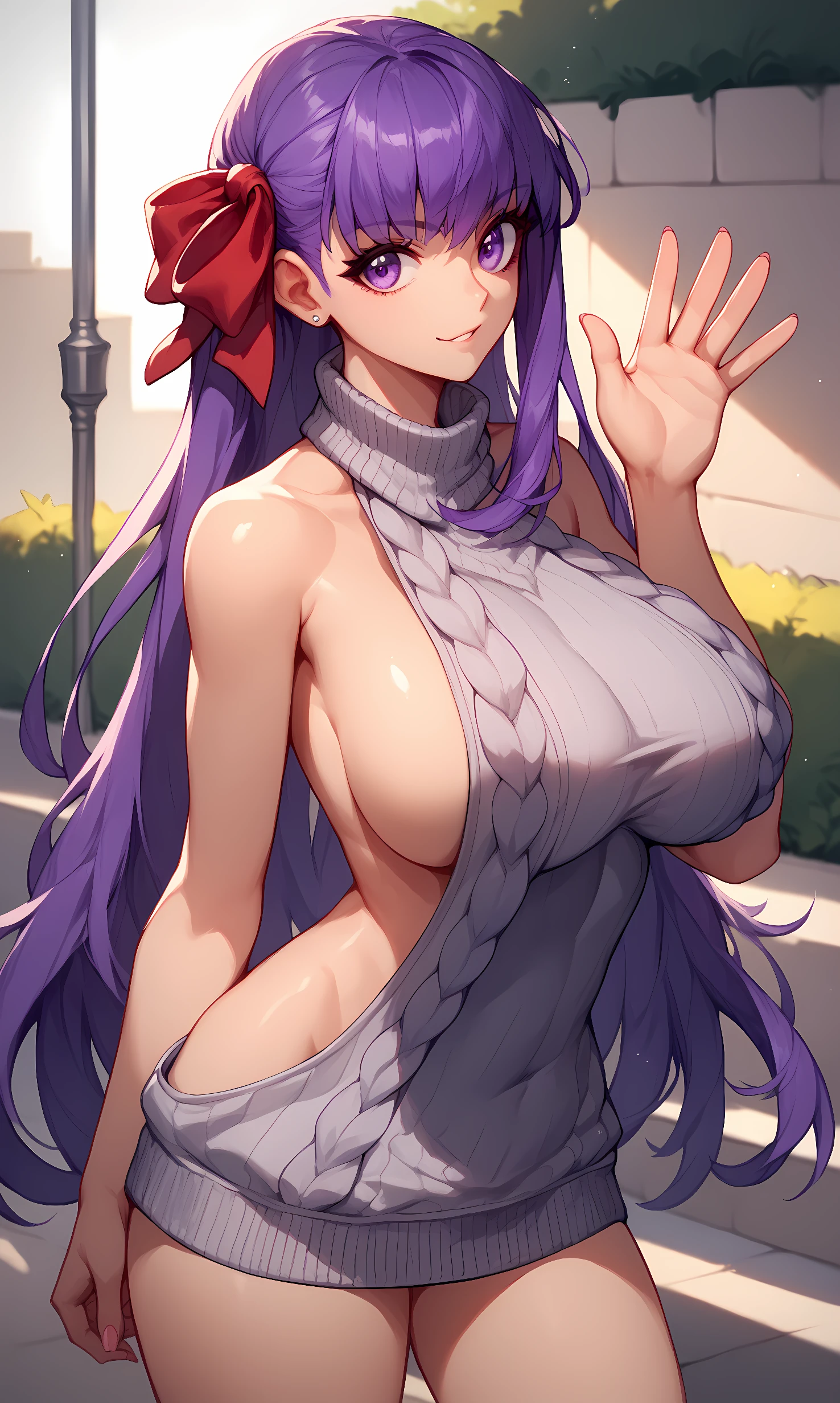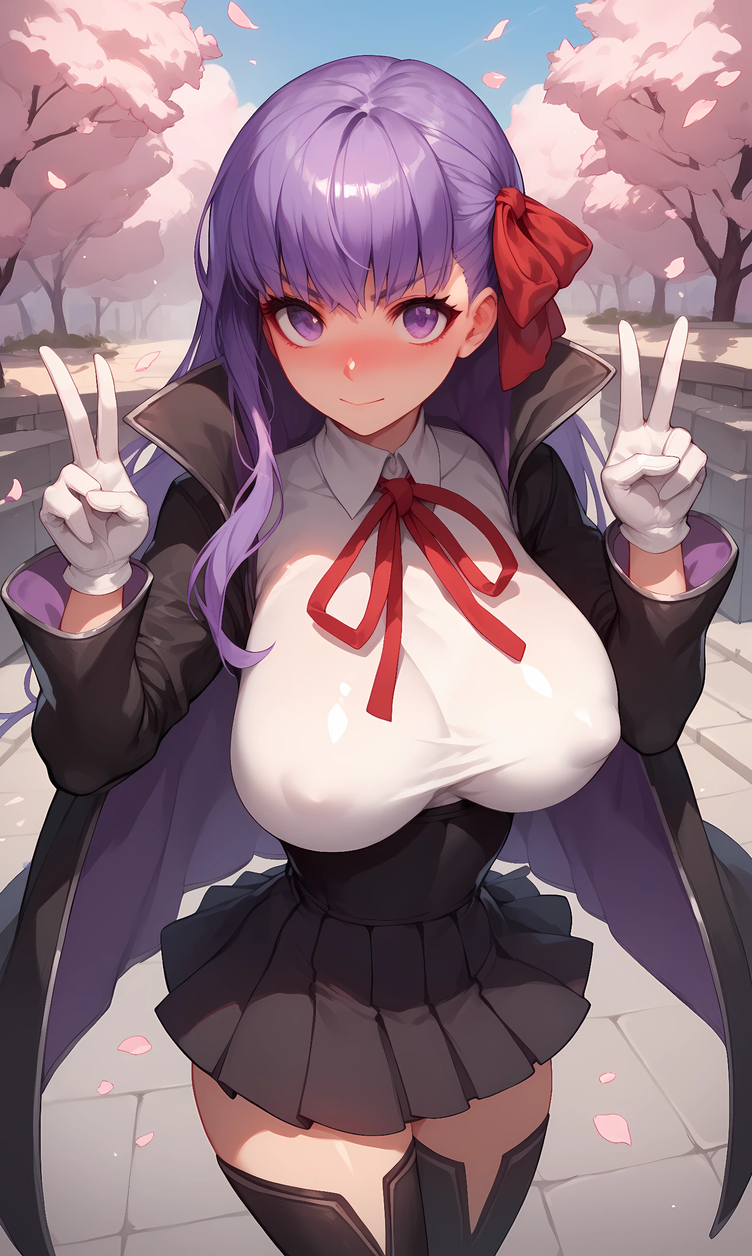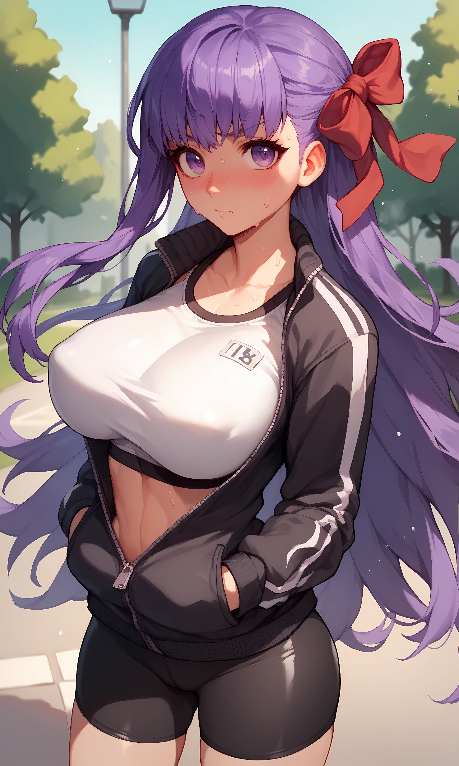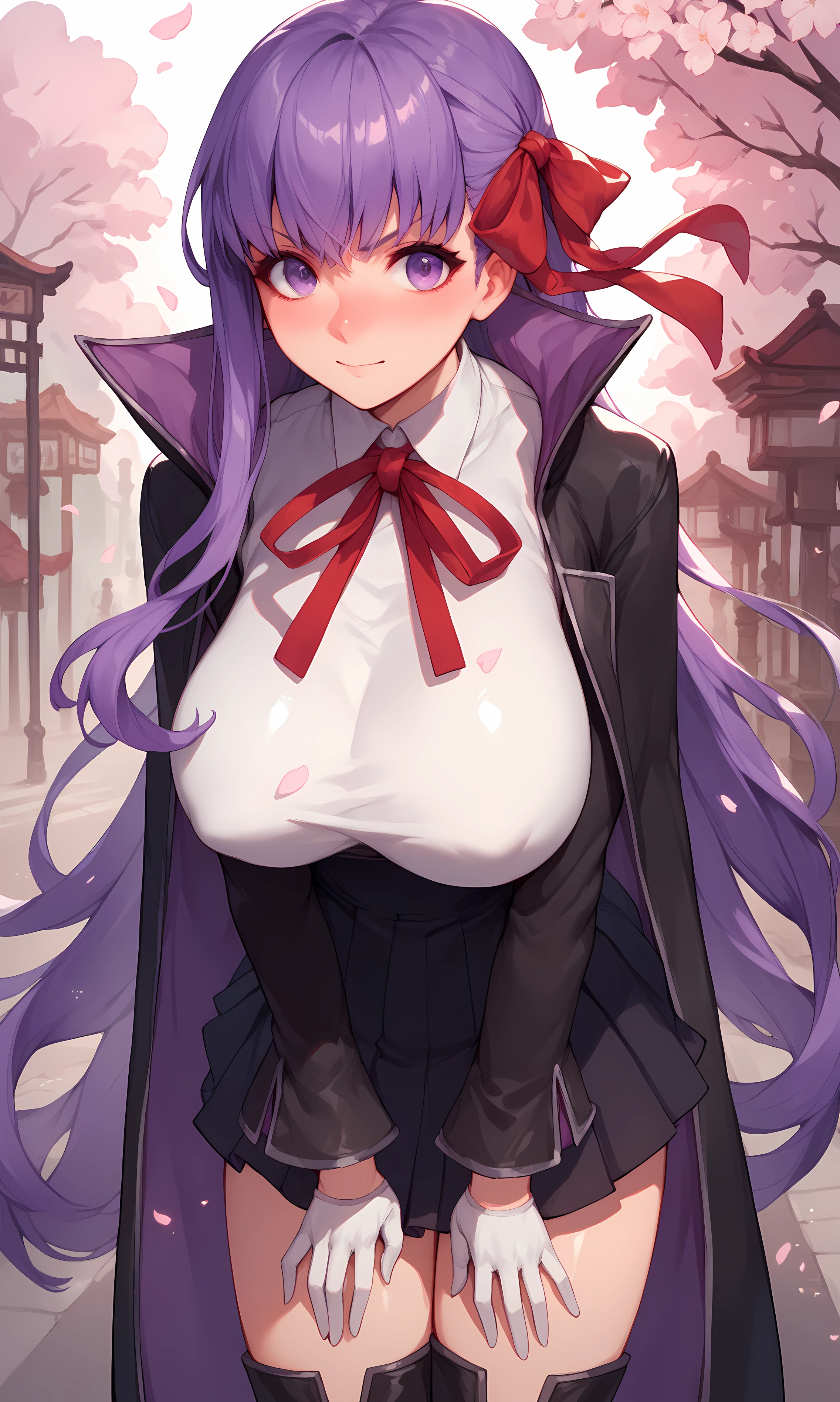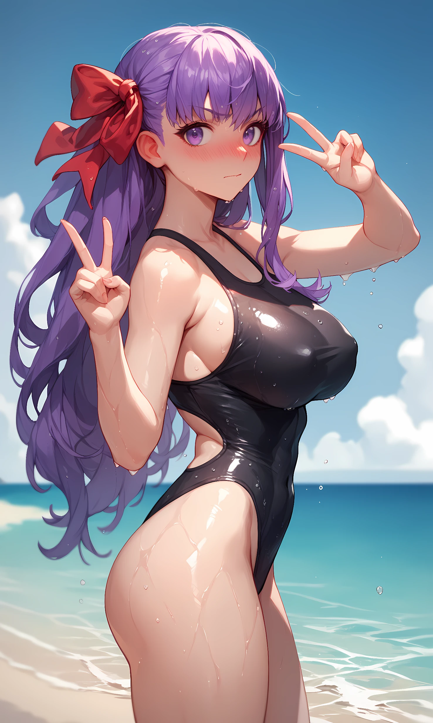 bb, purple eyes, purple hair, long hair, bangs, red bow, hair bow