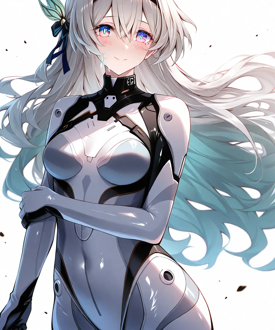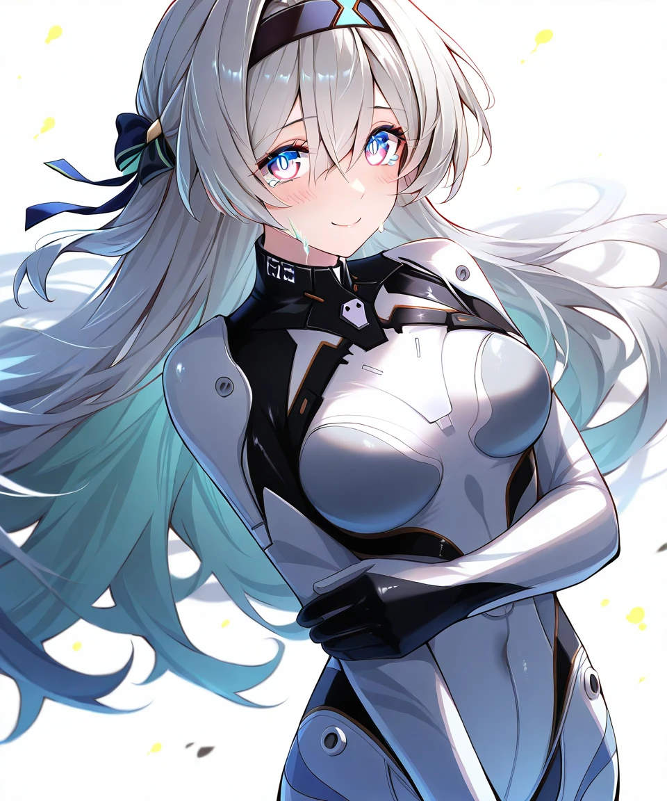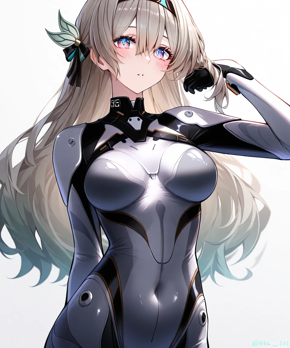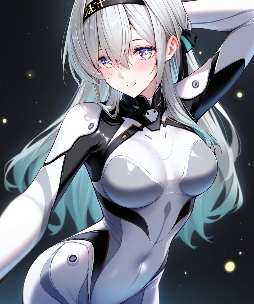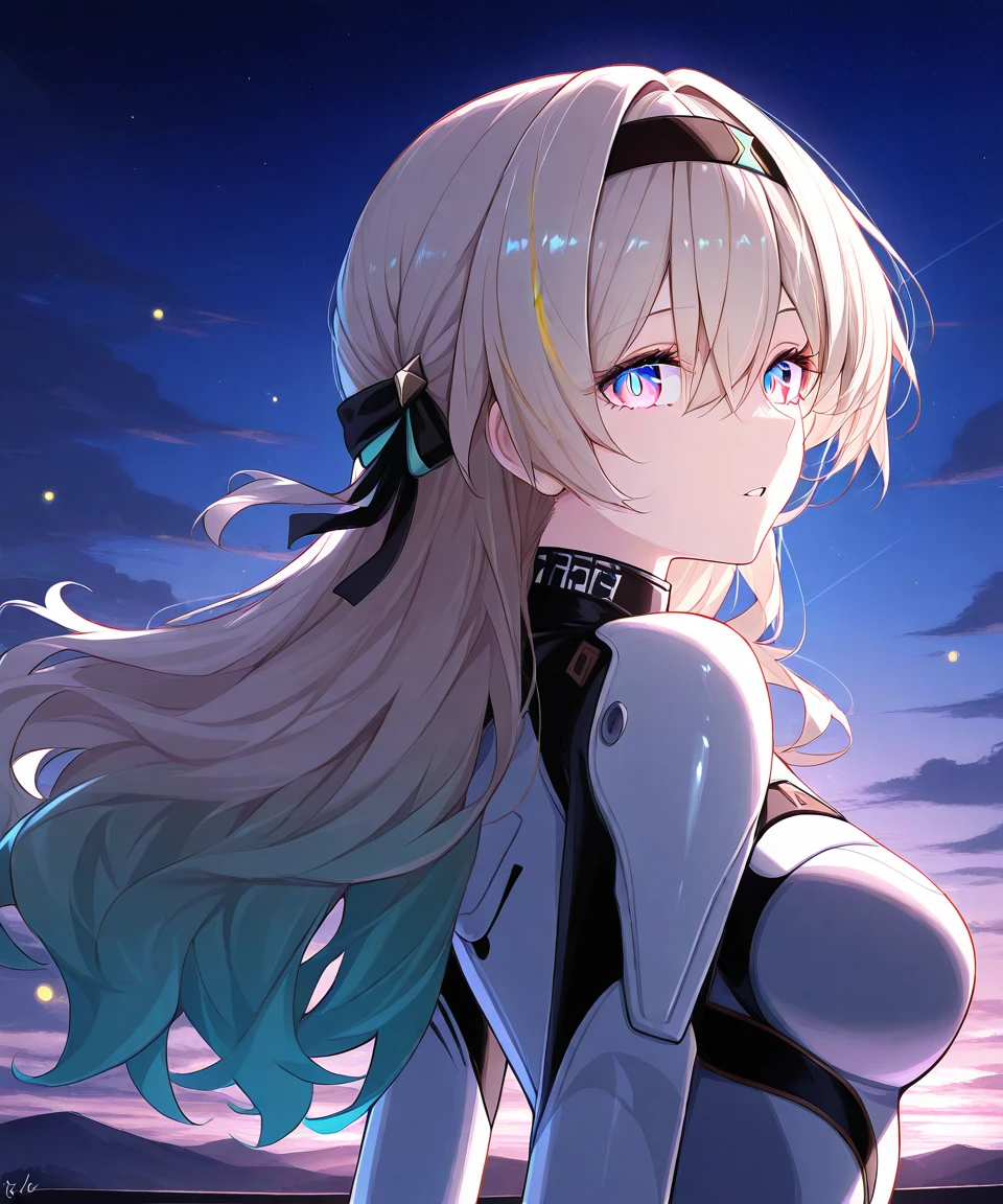 外观:silver hair,long hair,streaked hair,multicolored hair,two-tone hair,[[aqua hair]],black hairband,hair ornament,bangs,multicolored eyes,pink eyes,blue eyes,