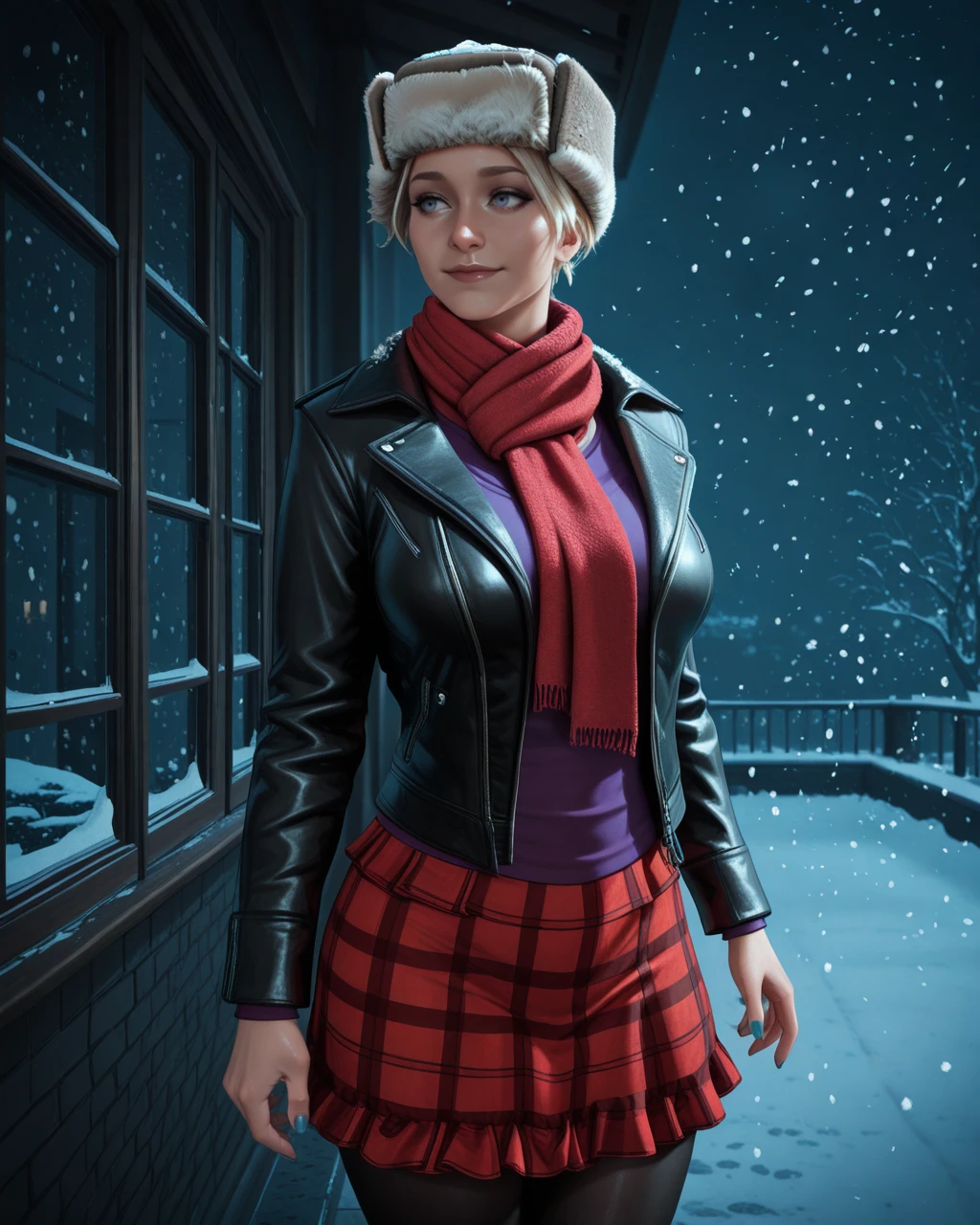 red plaid skirt, red scarf, black pantyhose, black leather jacket, ushanka, purple shirt