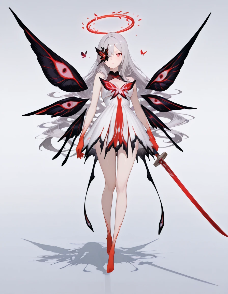 maipgrchaos,very_long_hair,red_eyes,bare_shoulders,grey_hair,sidelocks,butterfly_over_eye,white_dress,floating,multiple_wings,barefoot,no halo,red halo,holding_swordRecommend preferred Strength: 0.7~1.