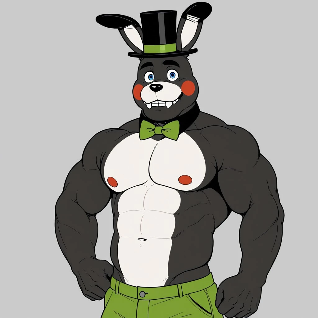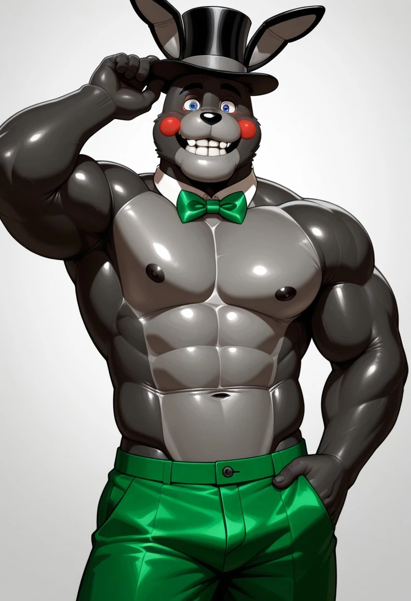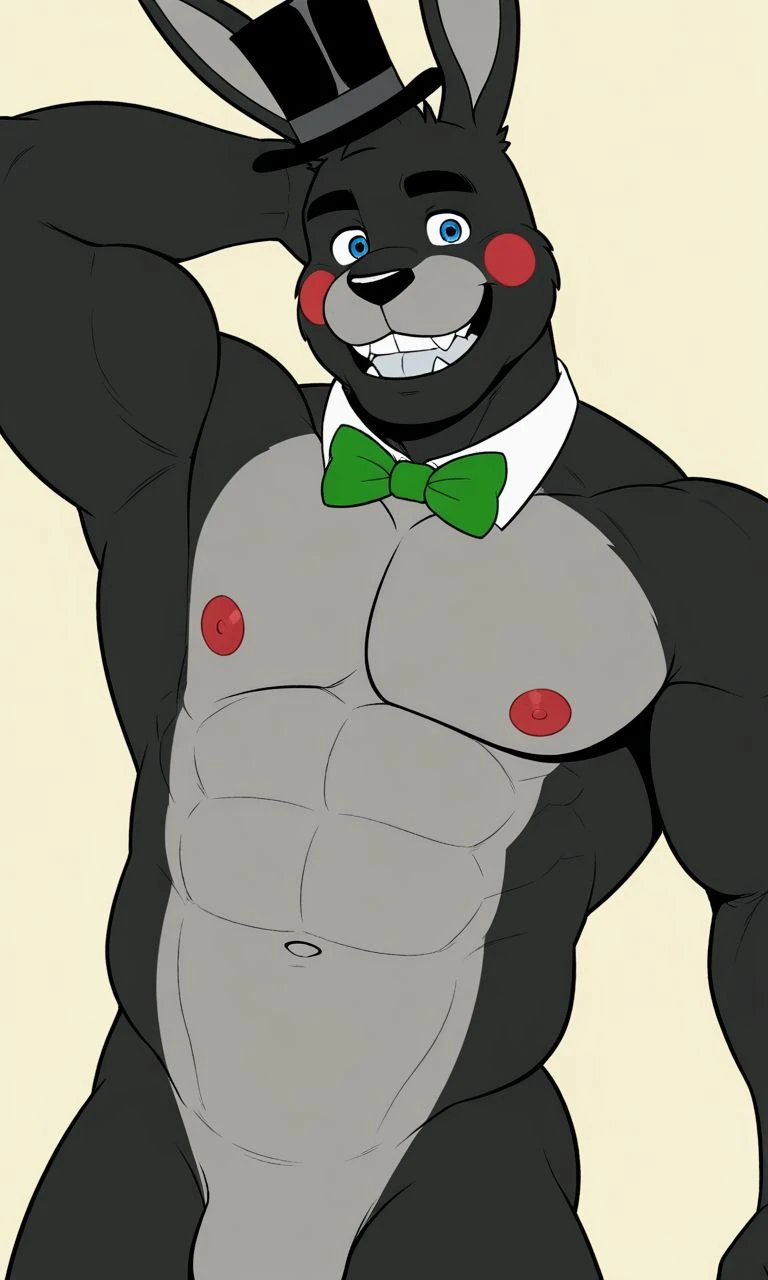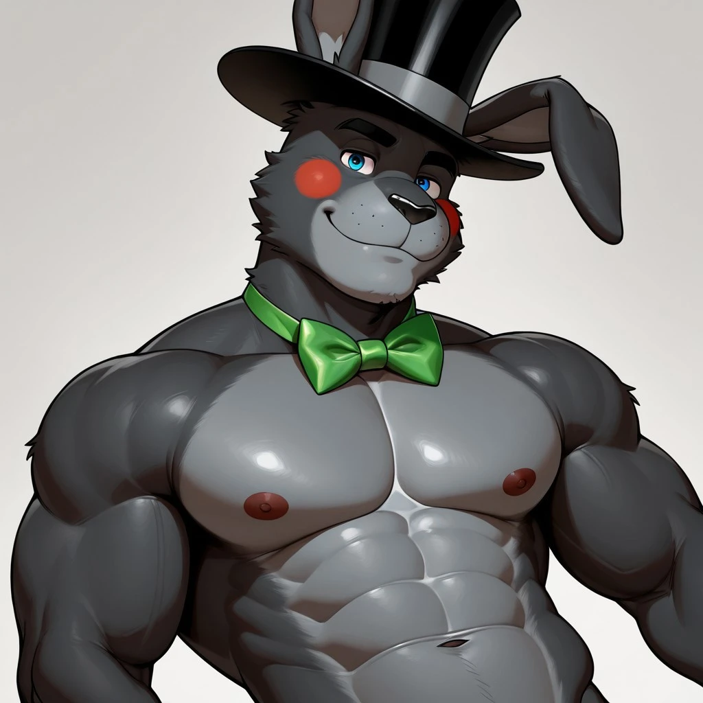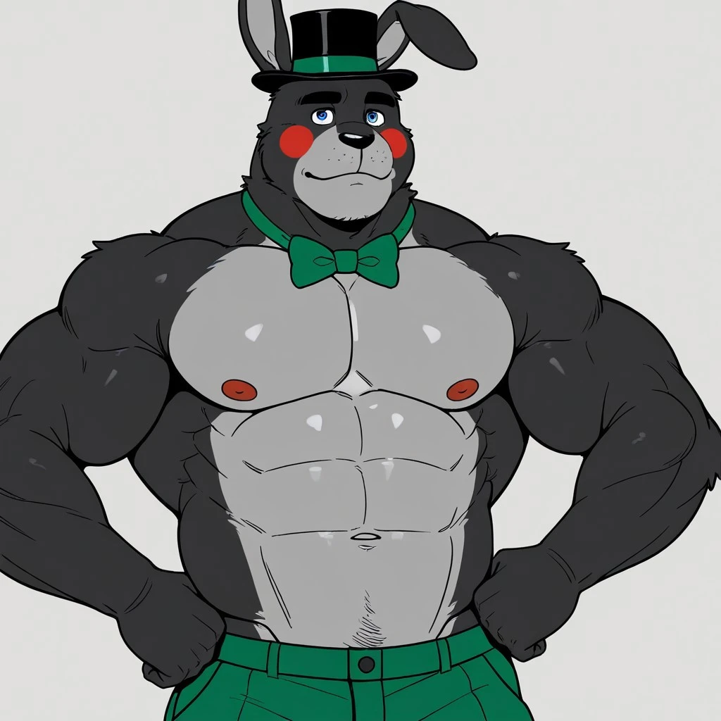 solo,male,anthro rabbit,black fur,gray mouth,gray stomach,gray inner ears,Green bowtie,black top-hat,blue eyes, Red Cheeks, Bara, muscular, black nose, smile