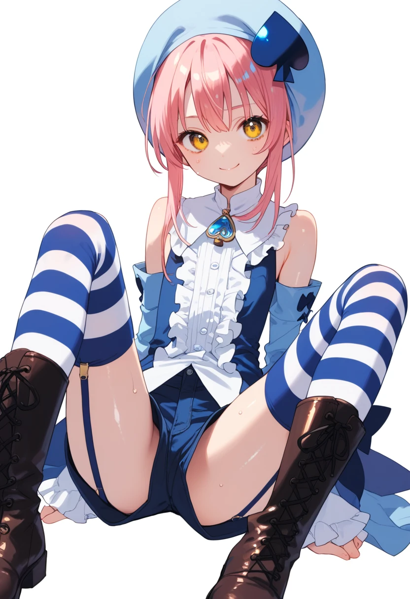 <lora:amulet_spade:1> amulet_spade, hat, pink hair, detached sleeves, striped, yellow eyes, lock button, striped thighhighs, shorts, frills, garter straps, spade (shape), boots:0.9