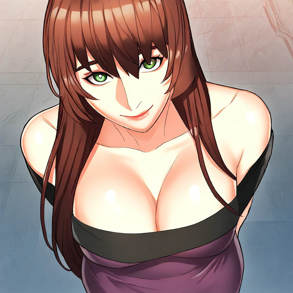 5. ((beautiful off-shoulder sexy purple dress with black edge, huge cleavage, obscene cleavage, )) , black high-heels,