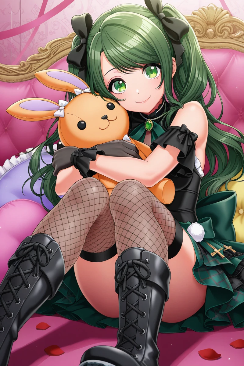 shimizuesora, 1girl, solo, skirt, thighhighs, green eyes, twintails, green hair, school uniform, jacket, long hair, plaid, ribbon, shirt, black thighhighs, plaid skirt, frilled skirt, collared shirt, looking at viewer, white shirt, frills, long sleeves, yoba school uniformCasual Esora: