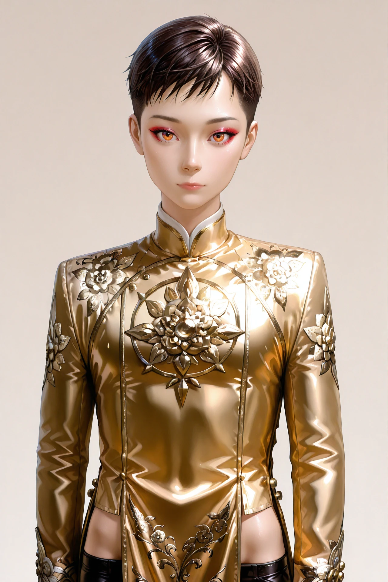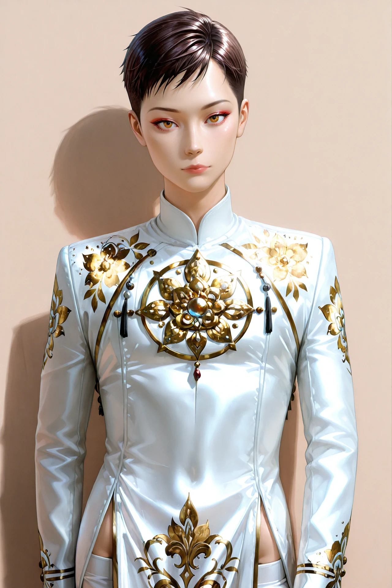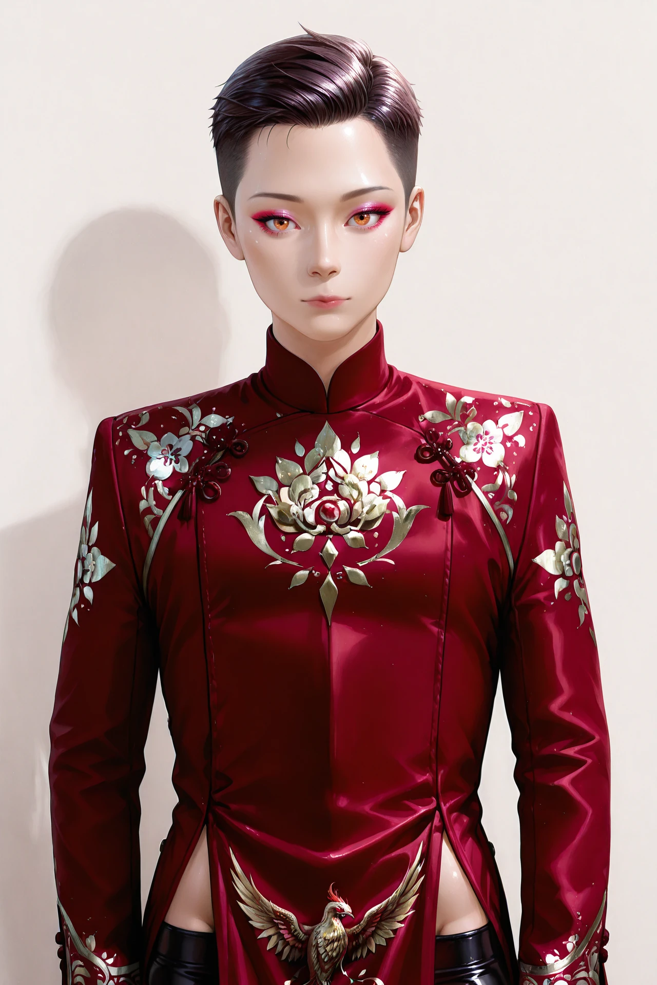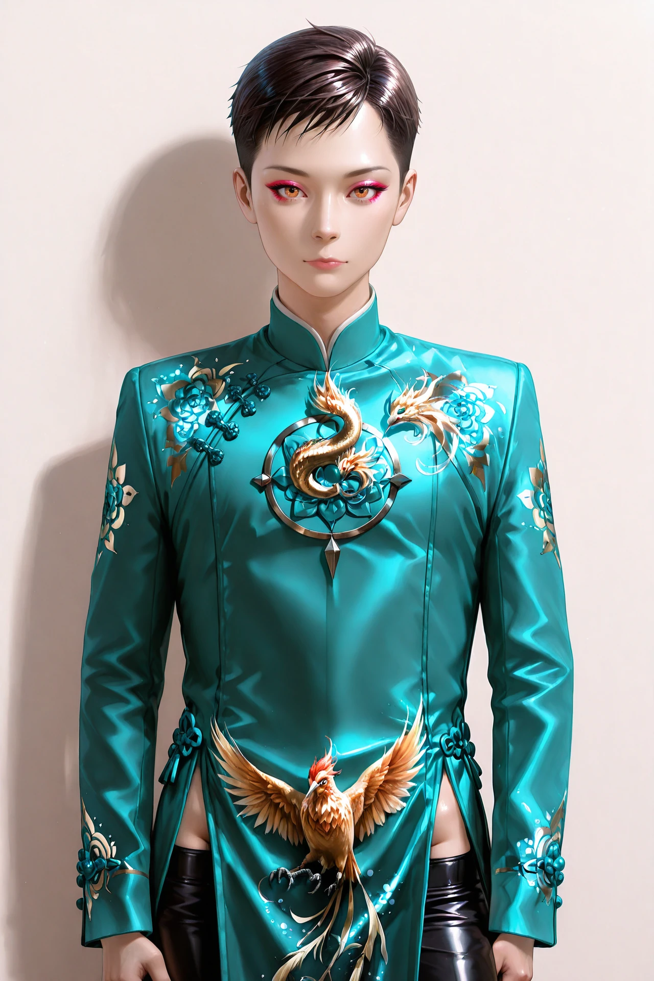 loose fluttering dress, ceremonial outfit, [add your color] dress, aodai-nam, high collar, long sleeves, silk, satin, jewelry, glitters, embroidery, delicate print, floral print, dragon print, phoenix print, fluttering pelvic curtain, tight pants, (lowleg pants, :1.2), side slit, accessories