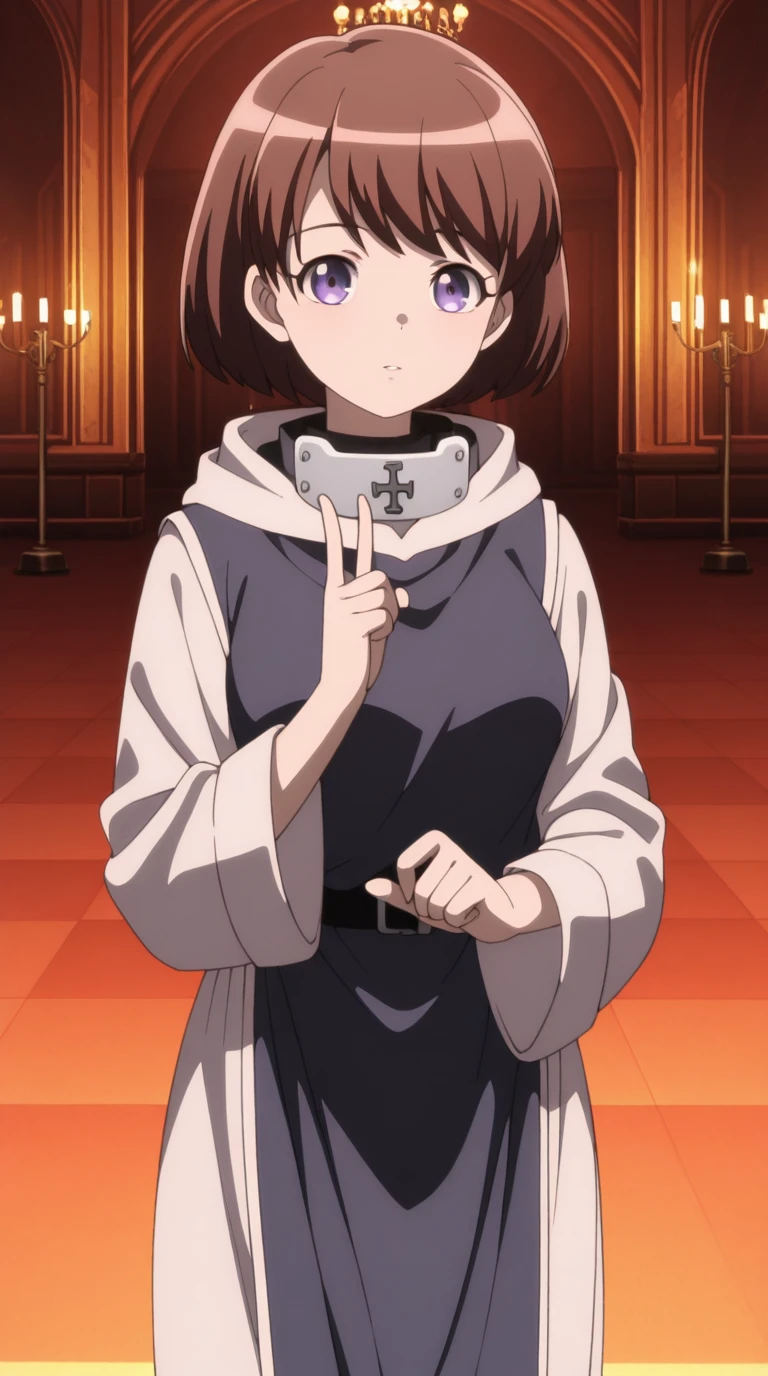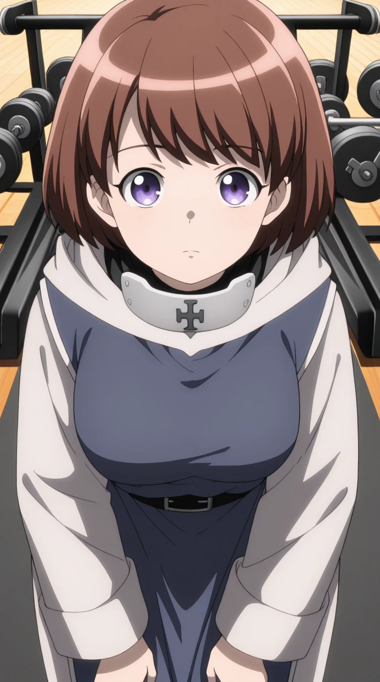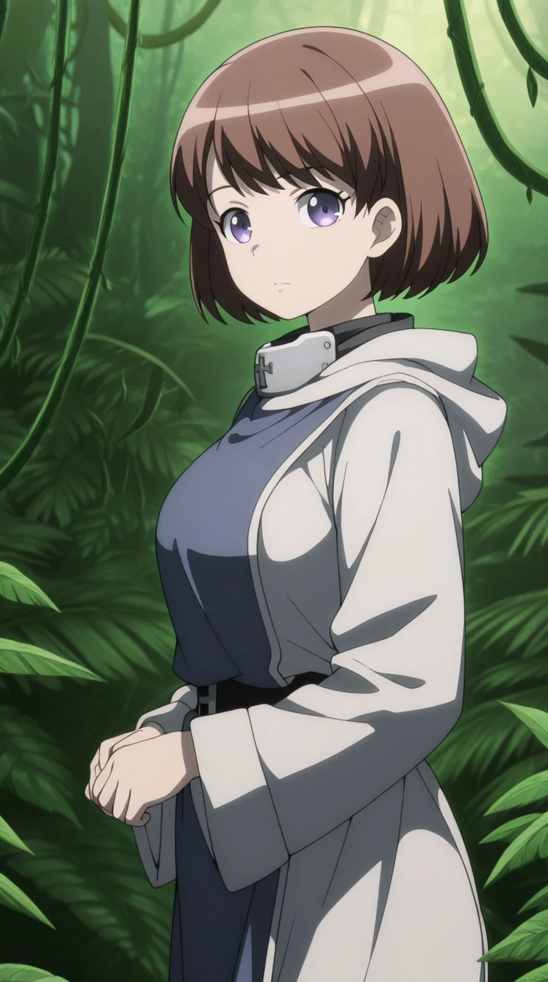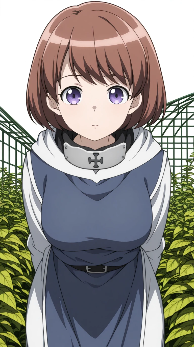 ninia, short hair, brown hair, purple eyes, bangs, mature female, medium breasts, anime screencap,