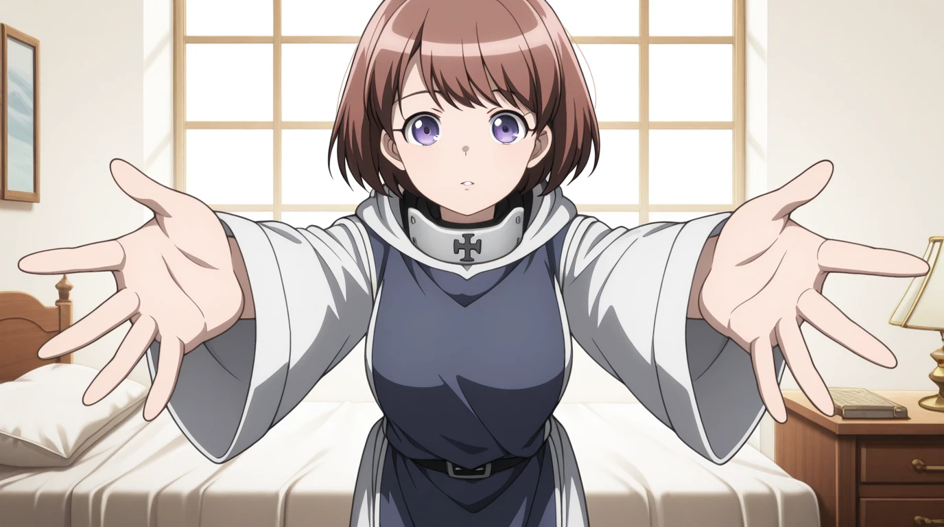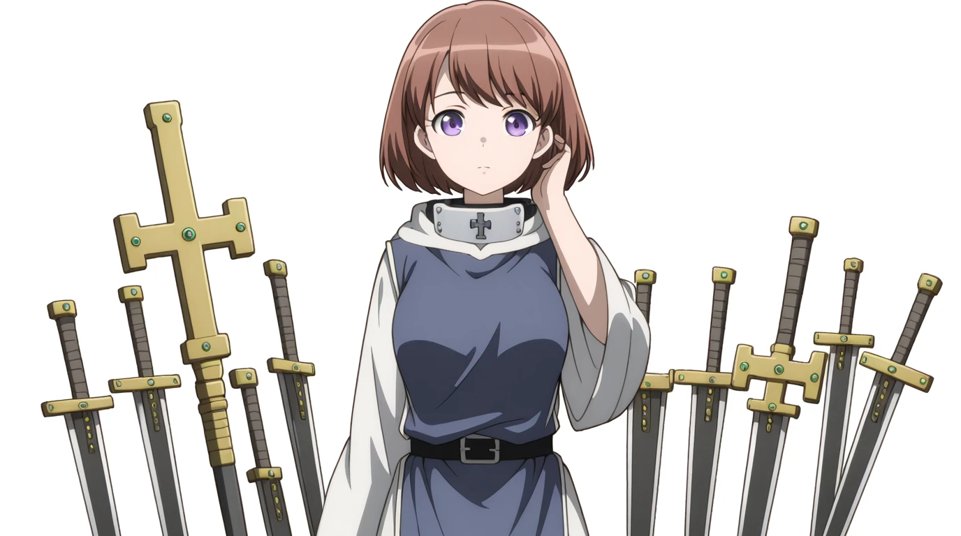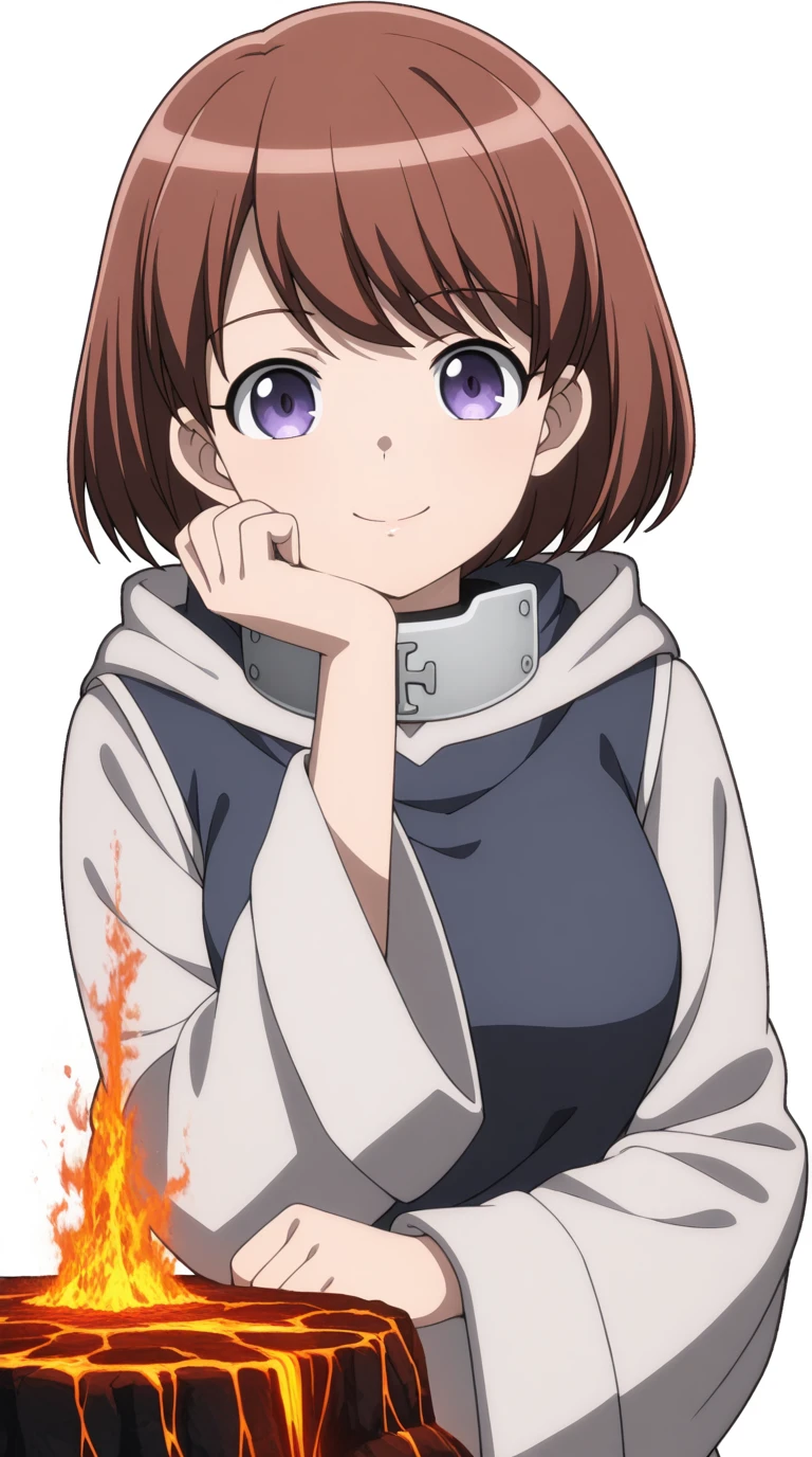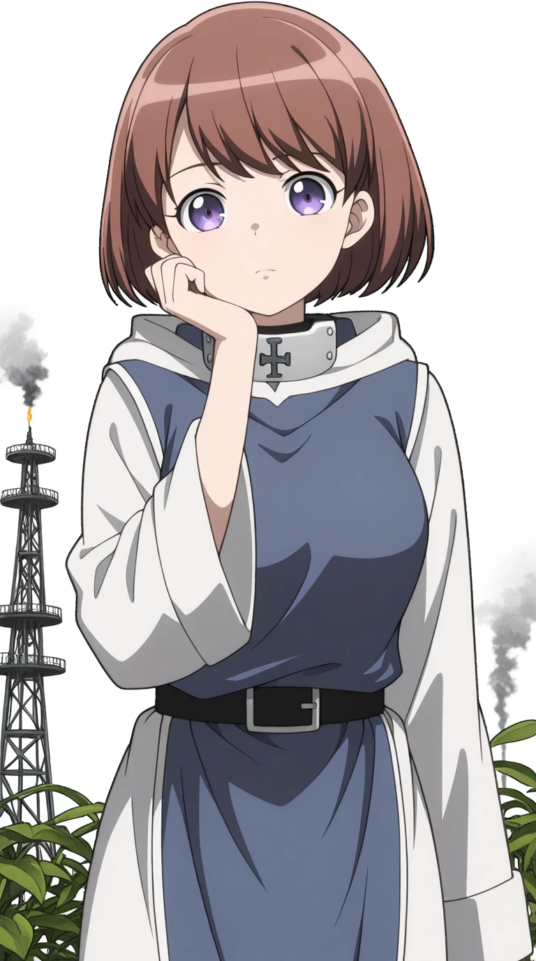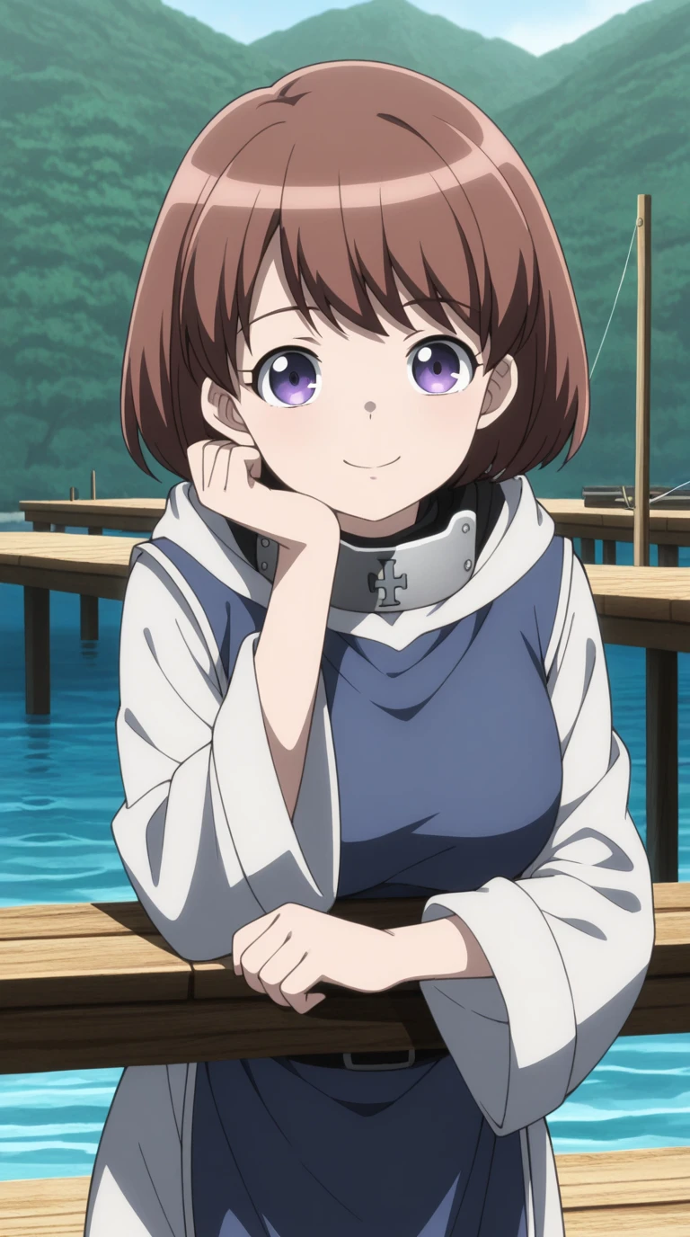 ninia, short hair, brown hair, purple eyes, bangs, mature female, medium breasts, anime screencap,