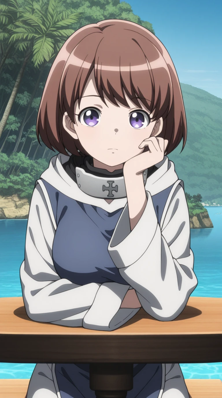 ninia, short hair, brown hair, purple eyes, bangs, mature female, , anime screencap,