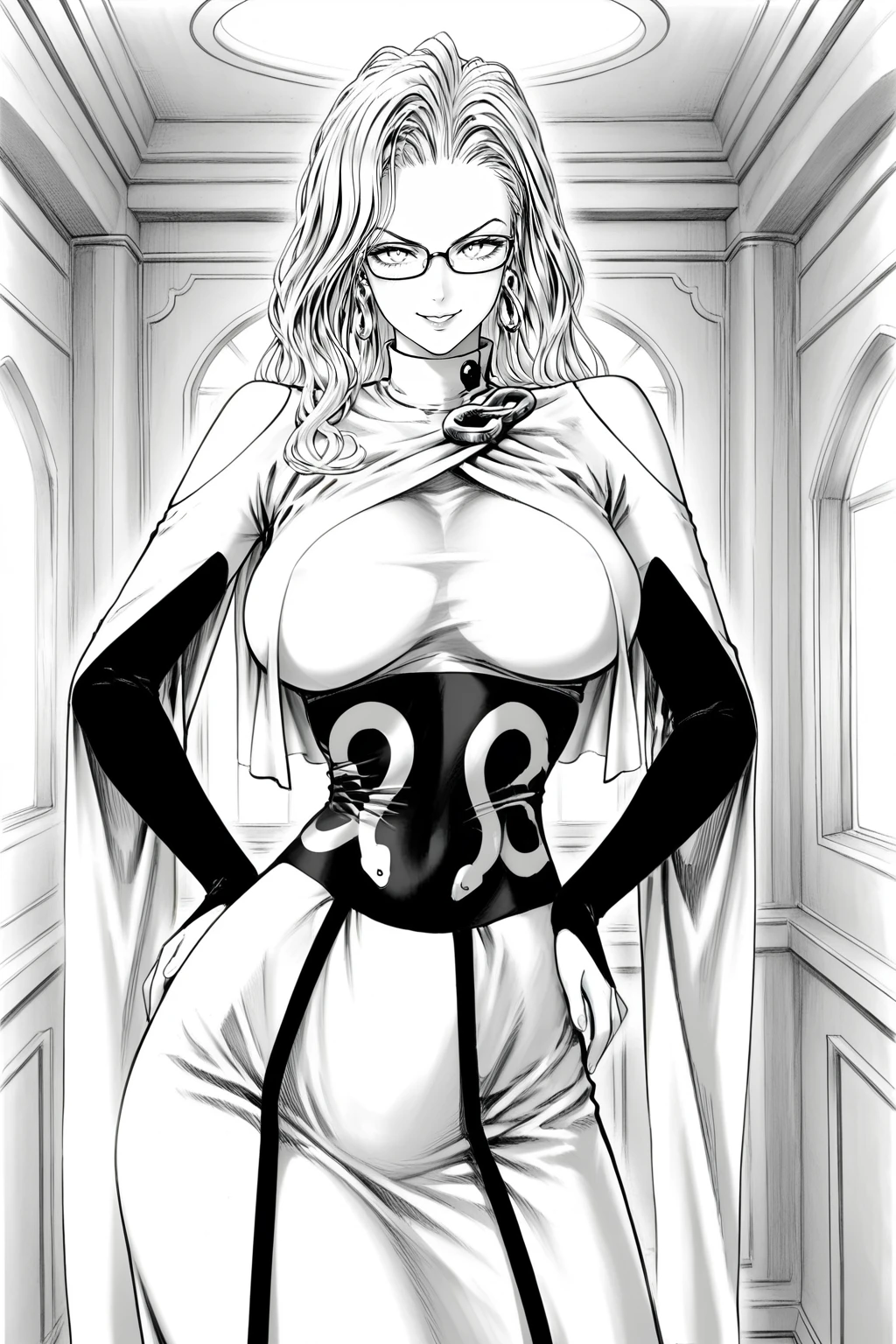 outfit trigger : [psykos_outfit], impossible clothes, white dress, turleneck dress, long dress, capelet, shoulder cutout, black gloves, bridal gauntlets, black corset, waist cape,