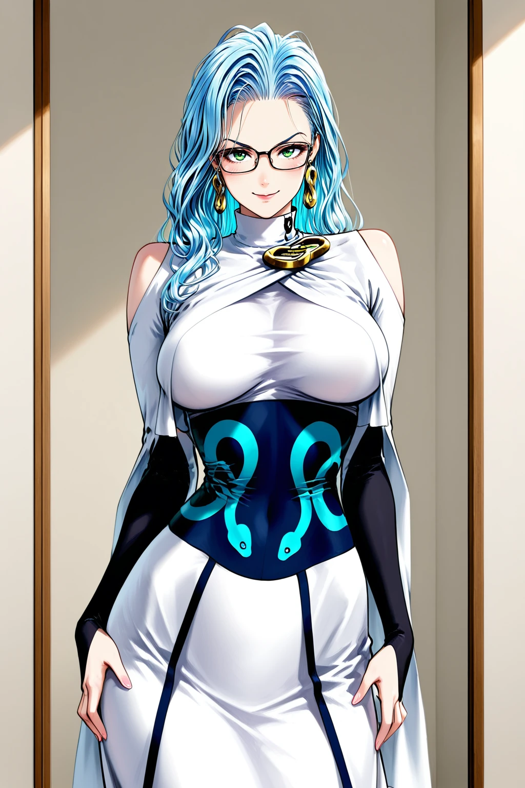 Color : psykos, 1girl, solo, green eyes, light blue hair, long hair, forehead, rectangular eyewear, glasses, earrings, curvy, voluptuous, large breasts,