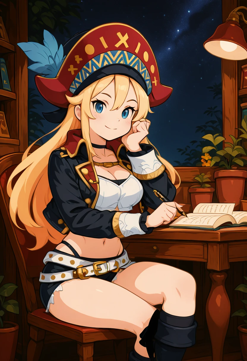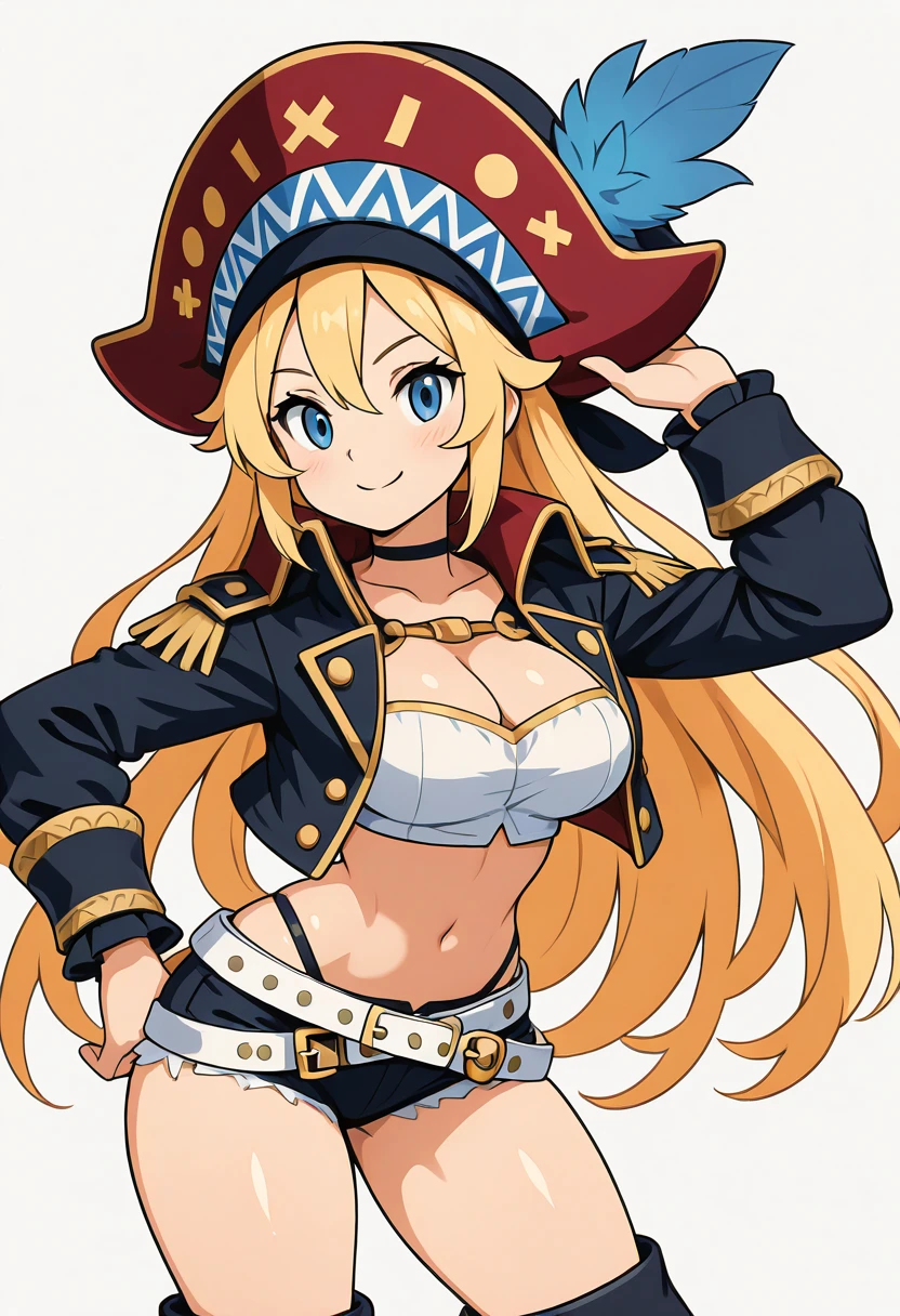 zzMayfair, blue eyes, hair between eyes, blonde hair, long hair, pirate hat, choker, white crop top, jacket, navel, short shorts, white belt, multiple belts, knee boots, red boots,