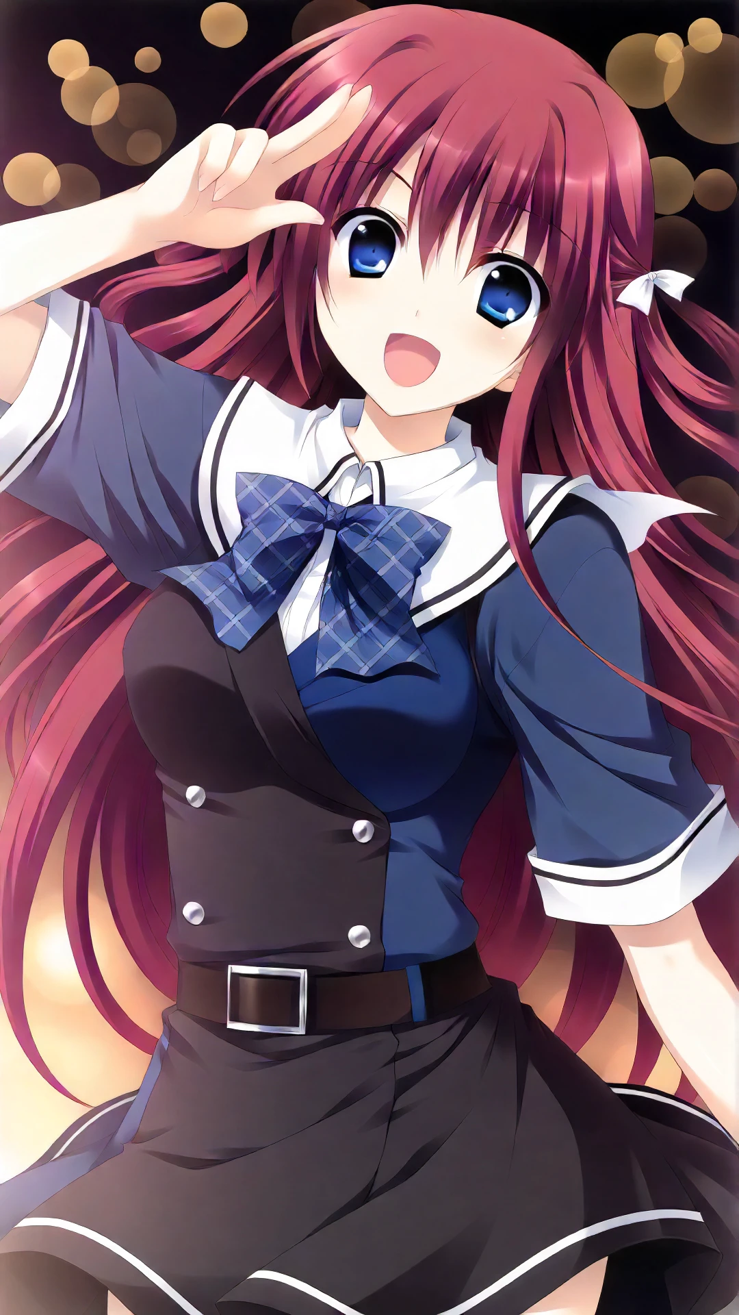 suou_amane, an anime girl, 1girl, solo, long hair, smile, open mouth, blue eyes, simple background, white background, school uniform, red hair